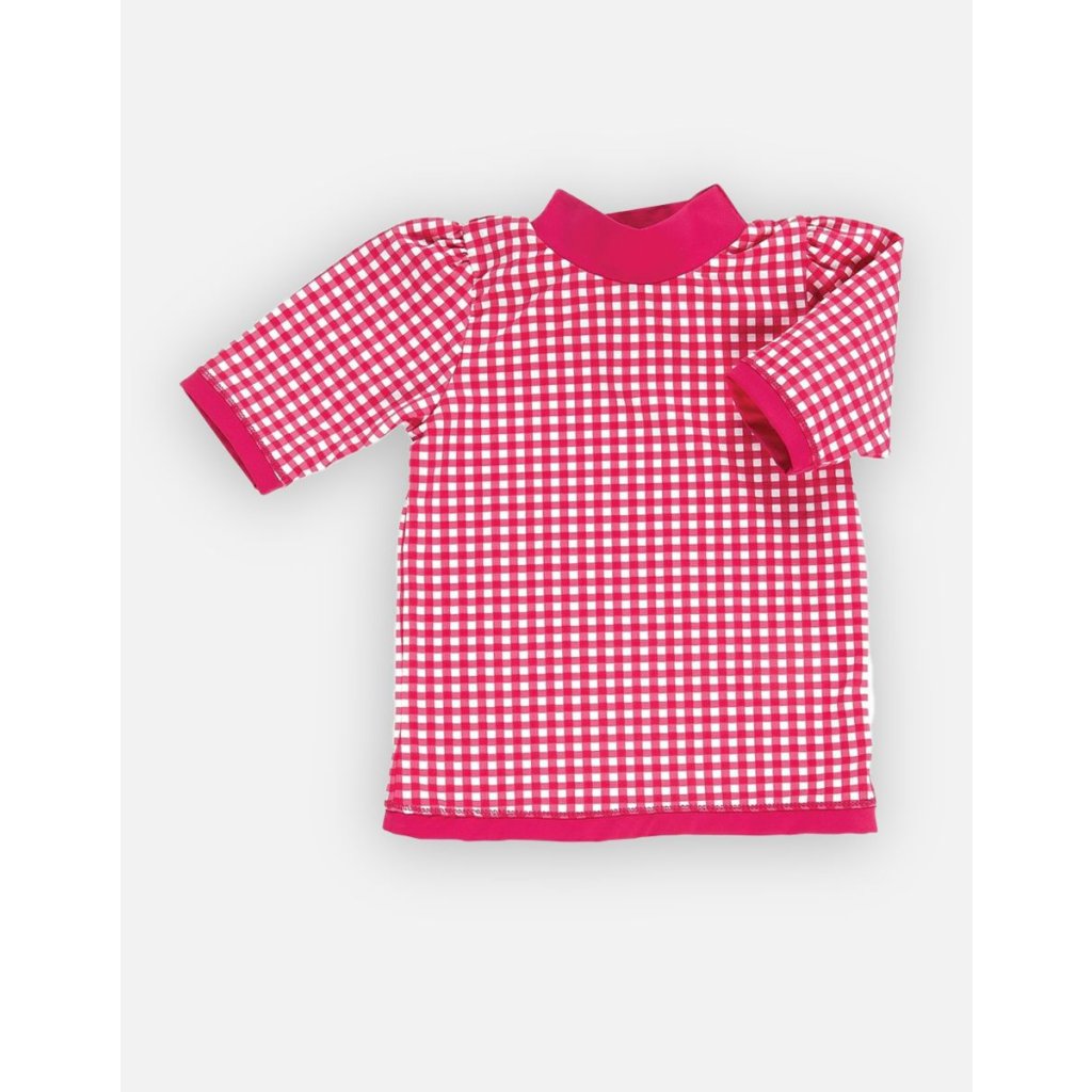 Tento červený UV top s krátkymi rukávmi, vysokým golierom, vďaka svojmu zloženiu blokuje slnečné lúče škodlivé pre pokožku tých najmenších. Nekryté časti tela by mali byť vždy chránené opaľovacím krémom s vysokým indexom.