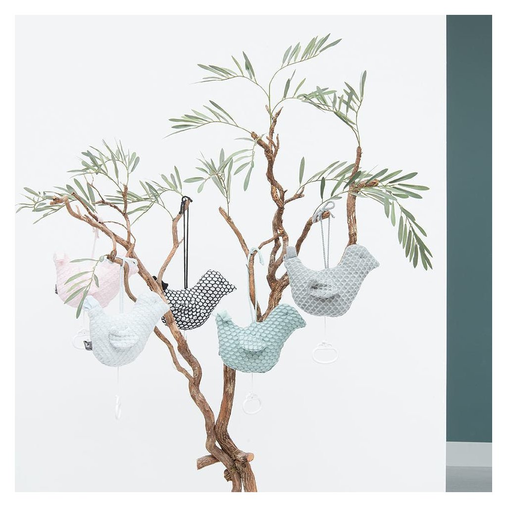 Hrací vtáčik z pleteného materiálu ako krásny doplnok do detskej izbičky.