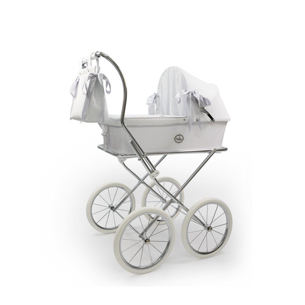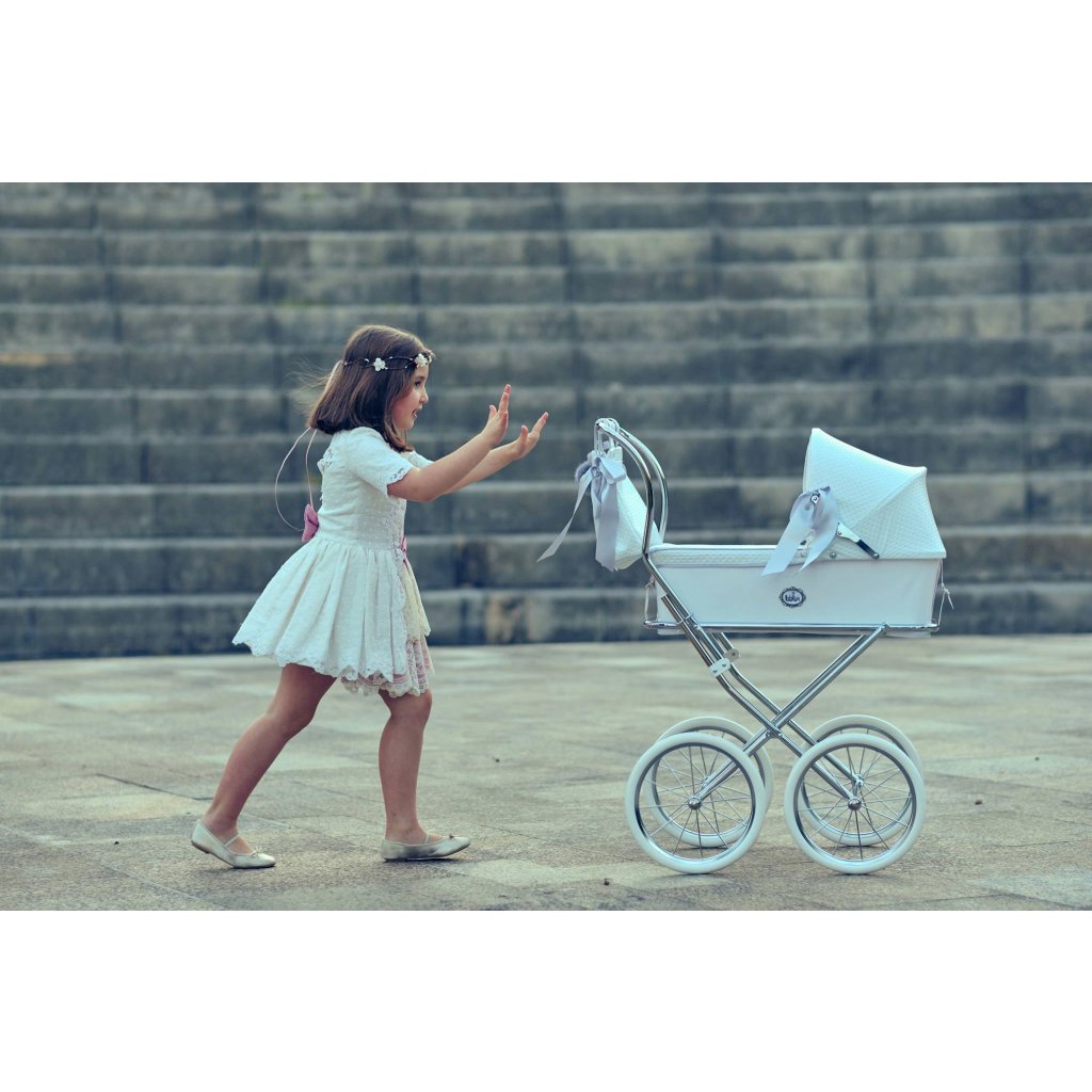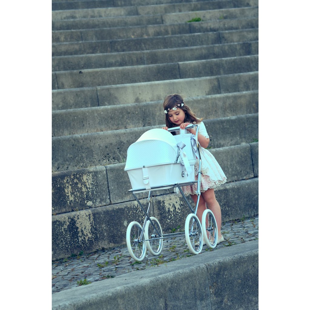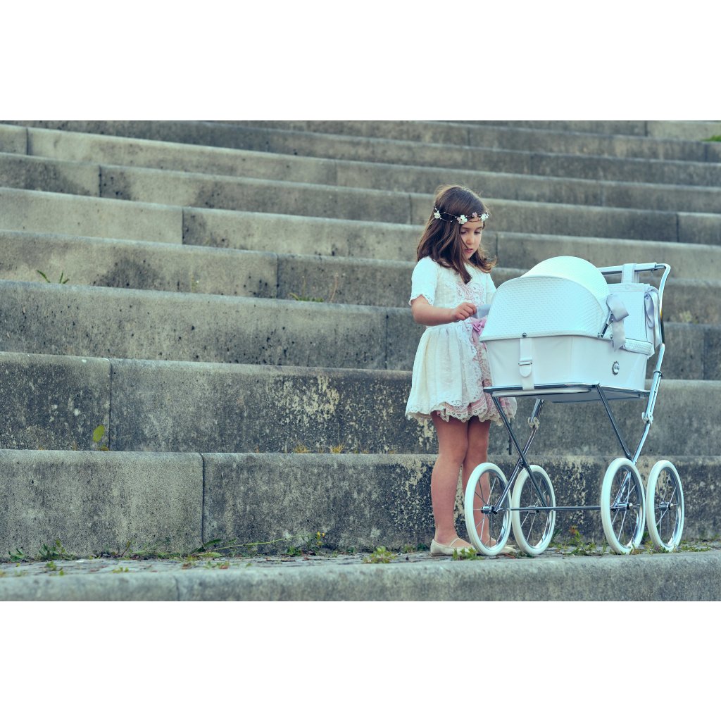 Luxusný kočík pre bábiky je určite tým najkrajším darčekom pre každú malú princeznú. Možnosť potlače vlastného textu - meno dieťaťa. V cene je zahrnutý kočík aj kožená biela taška na kočík. Rozmer vaničky 40 x 64 cm, hĺbka 16cm.