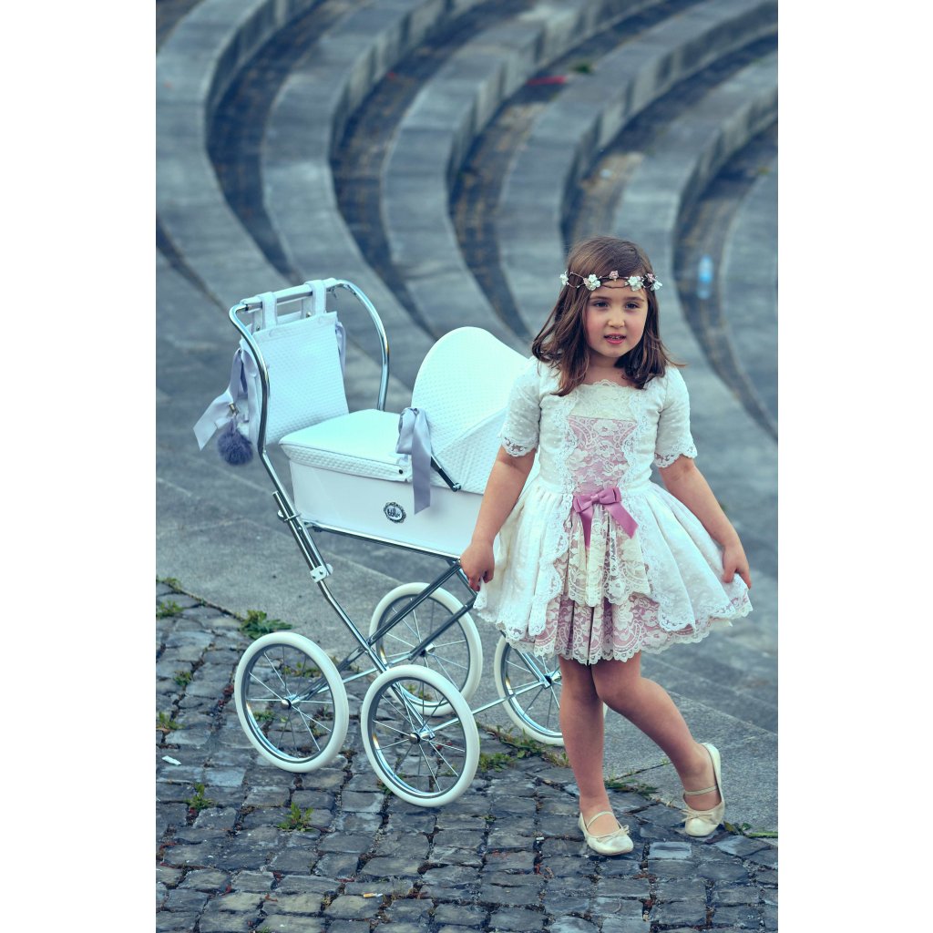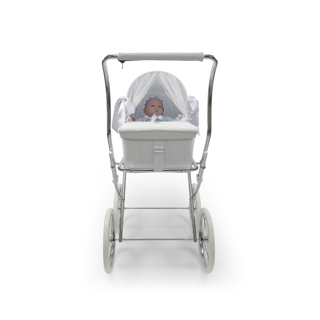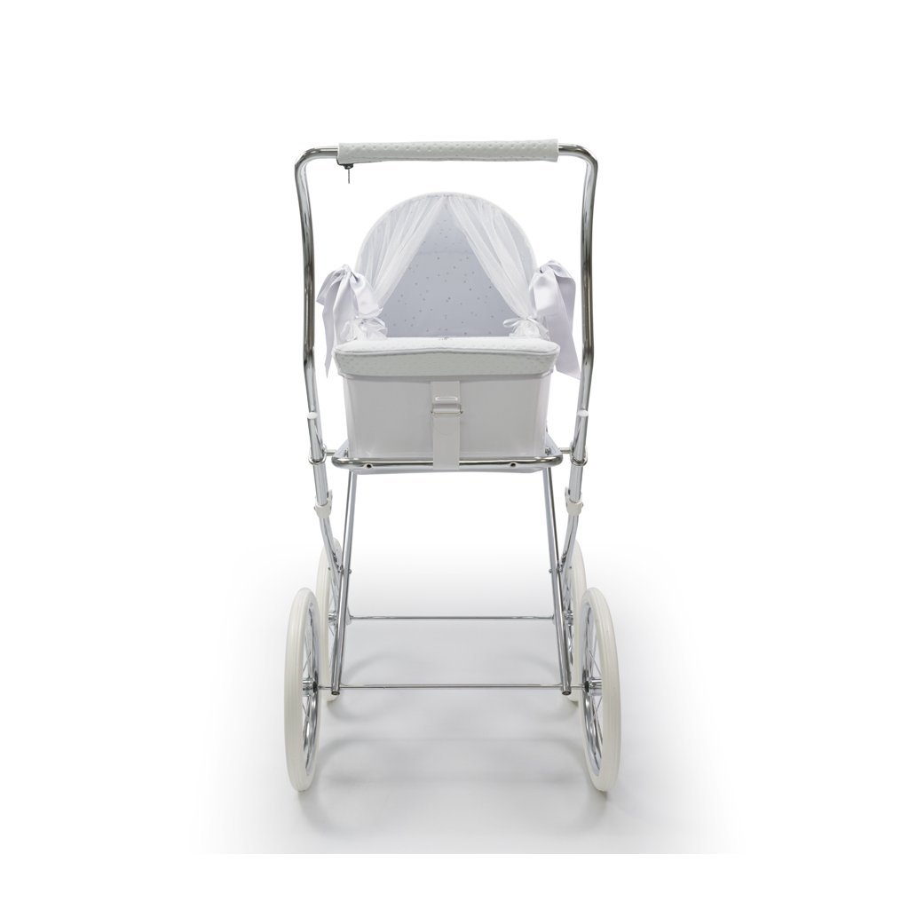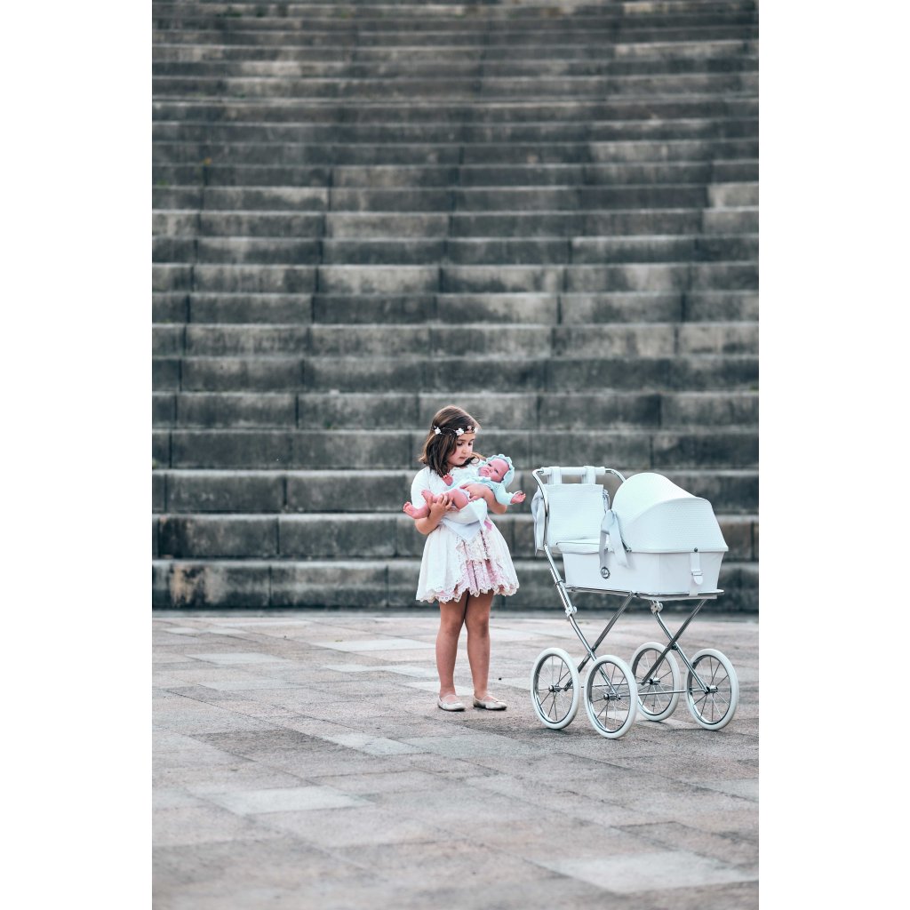 Luxusný kočík pre bábiky je určite tým najkrajším darčekom pre každú malú princeznú. Možnosť potlače vlastného textu - meno dieťaťa. V cene je zahrnutý kočík aj kožená biela taška na kočík. Rozmer vaničky 40 x 64 cm, hĺbka 16cm.