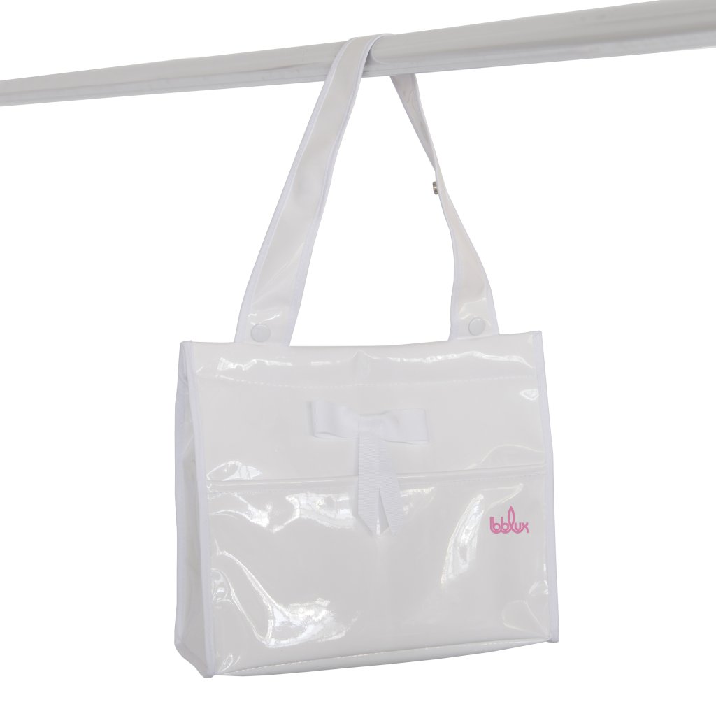 Praktická taška ku kočíku Bebelux vyrobená z lakovanej kože. Je vhodná na všetky kočíky Bebelux a zároveň vďaka dlhému ušku je vhodná aj na rameno. Taška je biela s ružovým logom. Rozmery: 29 x 24 cm