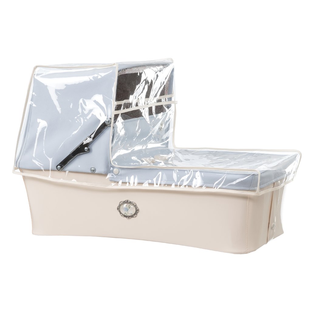 Praktická priesvitná pláštenka ku kočíku Bebelux s jemným krémovým (smotanovým) lemom.