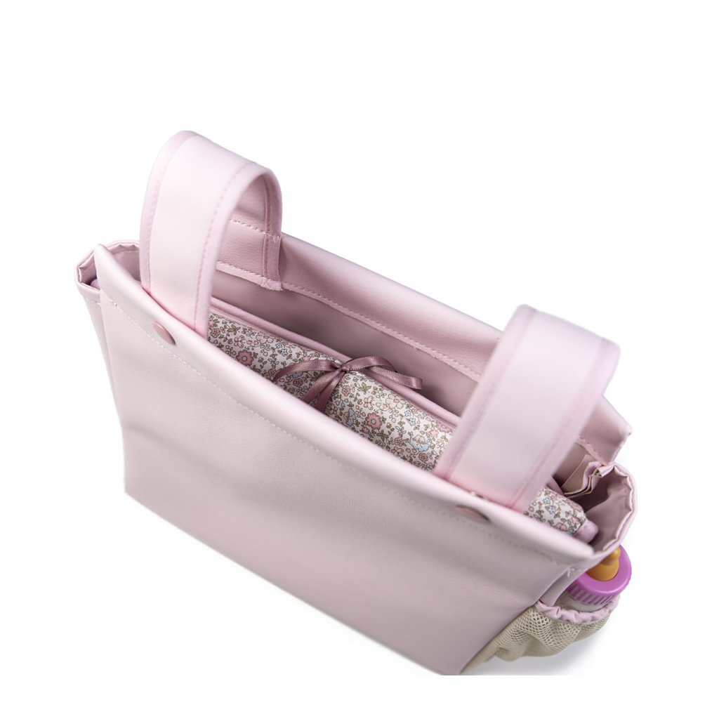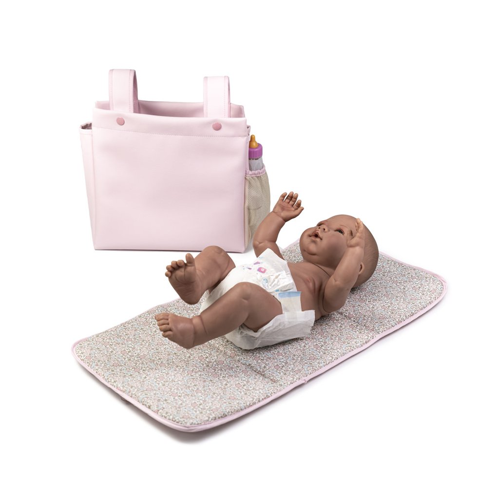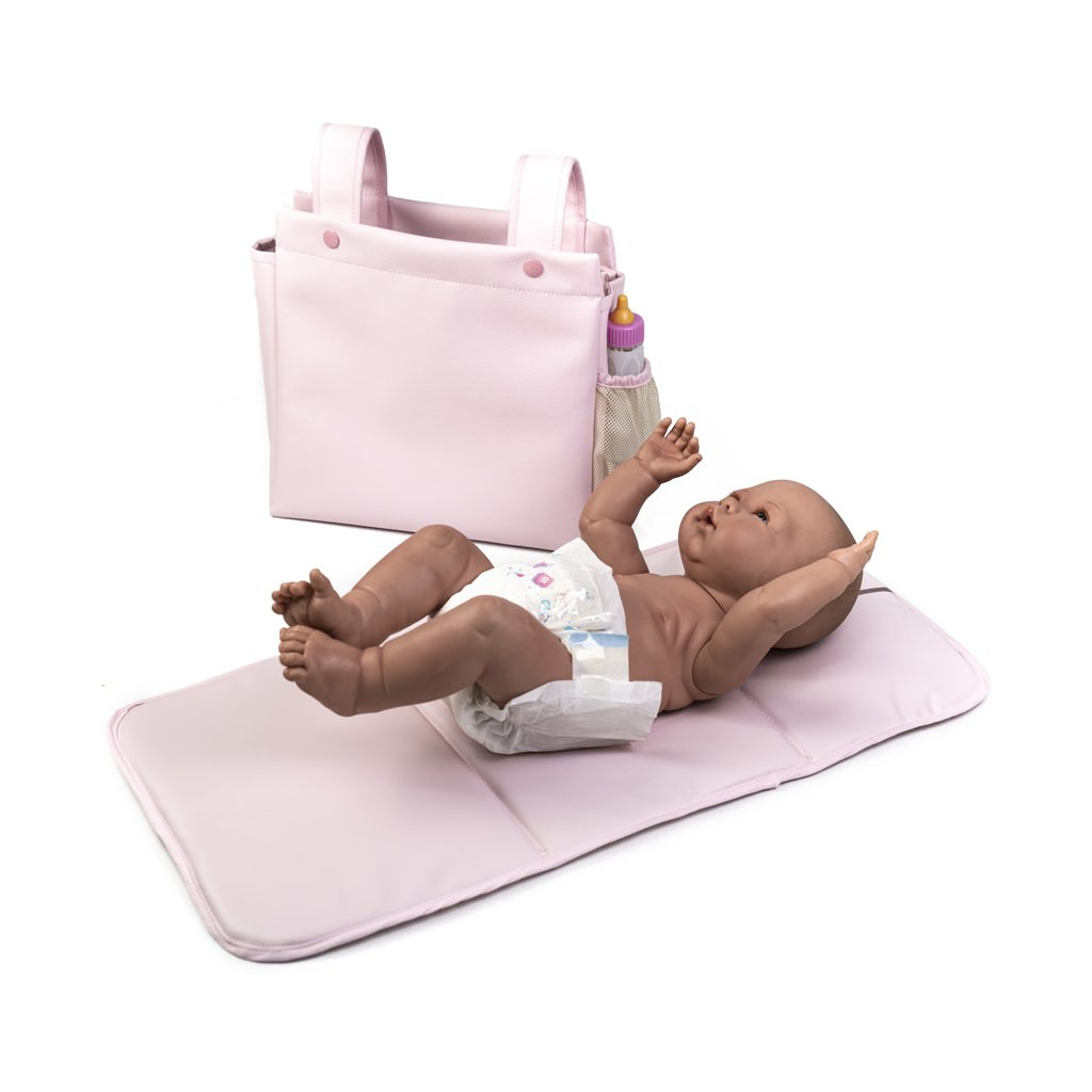 Praktická taška na kočík pre bábiky, ktorá je veľmi nápomocná pri prebaľovaní bábiky. Obsahuje 2 praktické priehradky, podložku na prebaľovanie a z bočnej strany má držiak na fľašku. Vyrobená z kvalitnej kože Nappa s vnútornou podšívkou. Ručne vyrábaná, 100% v Španielsku.