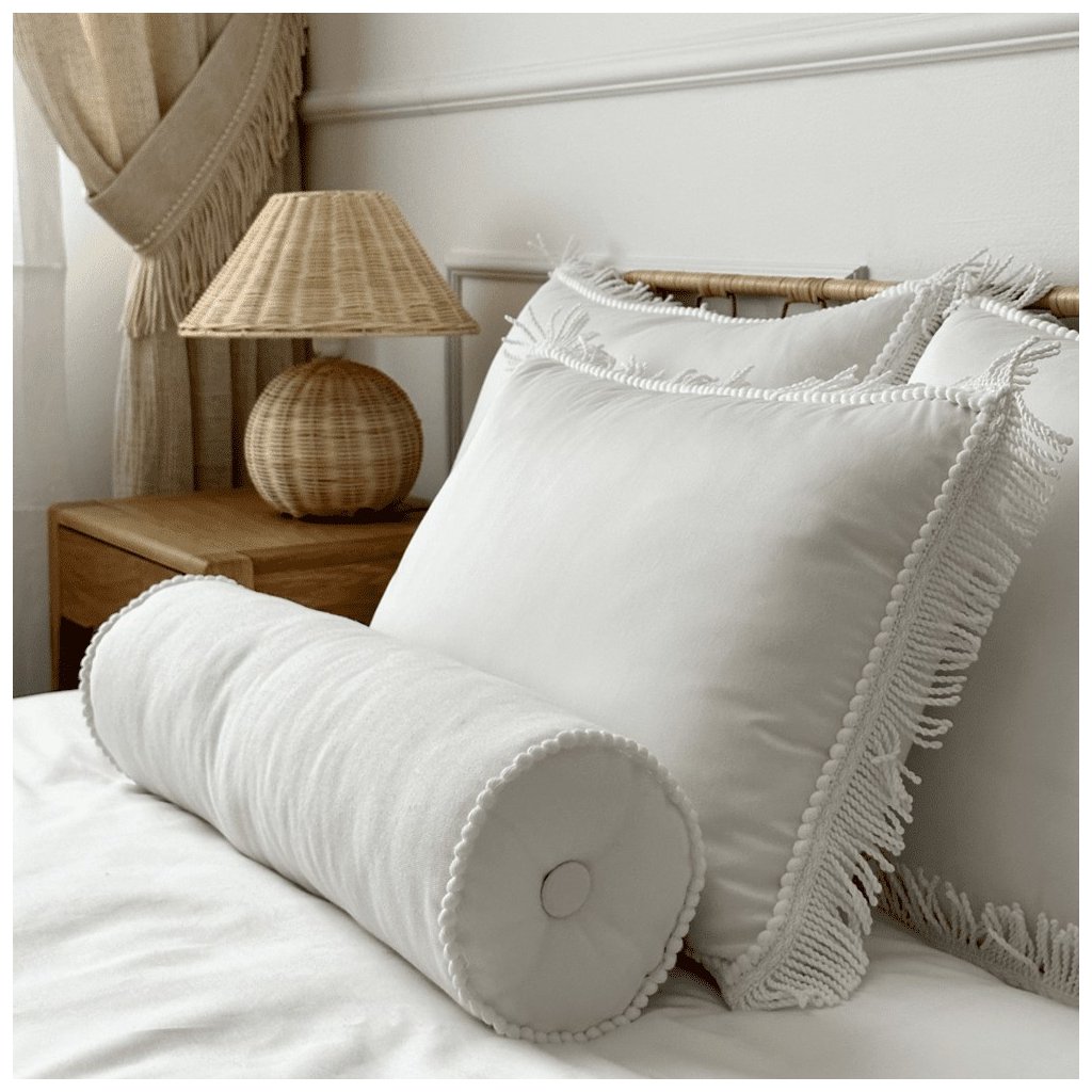 Biely štvorcový vankúš Boho Twist s výplňou a zdobený točenými strapcami je vyrobený z prémiovej saténovej bavlny. Môže byť skvelým doplnkom obliečok Boho Twist, ale aj samostatne ozdobiť interiér.