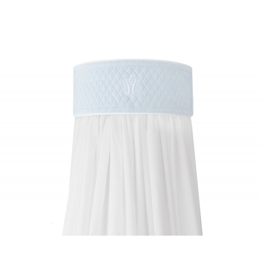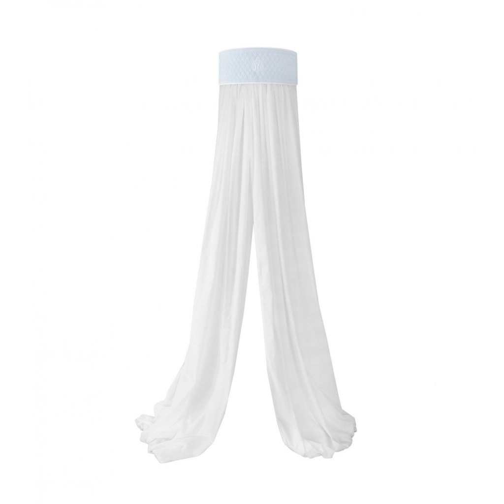 Krásny baldachýn do detskej izby. Vyrobený zo saténovej bielej bavlny, obohatený o elegantnú modrú ozdobnú časť v tvare polkruhu. Upevnenie je potiahnuté baby modrou prešívanou látkou zdobenou peknou mašličkou.