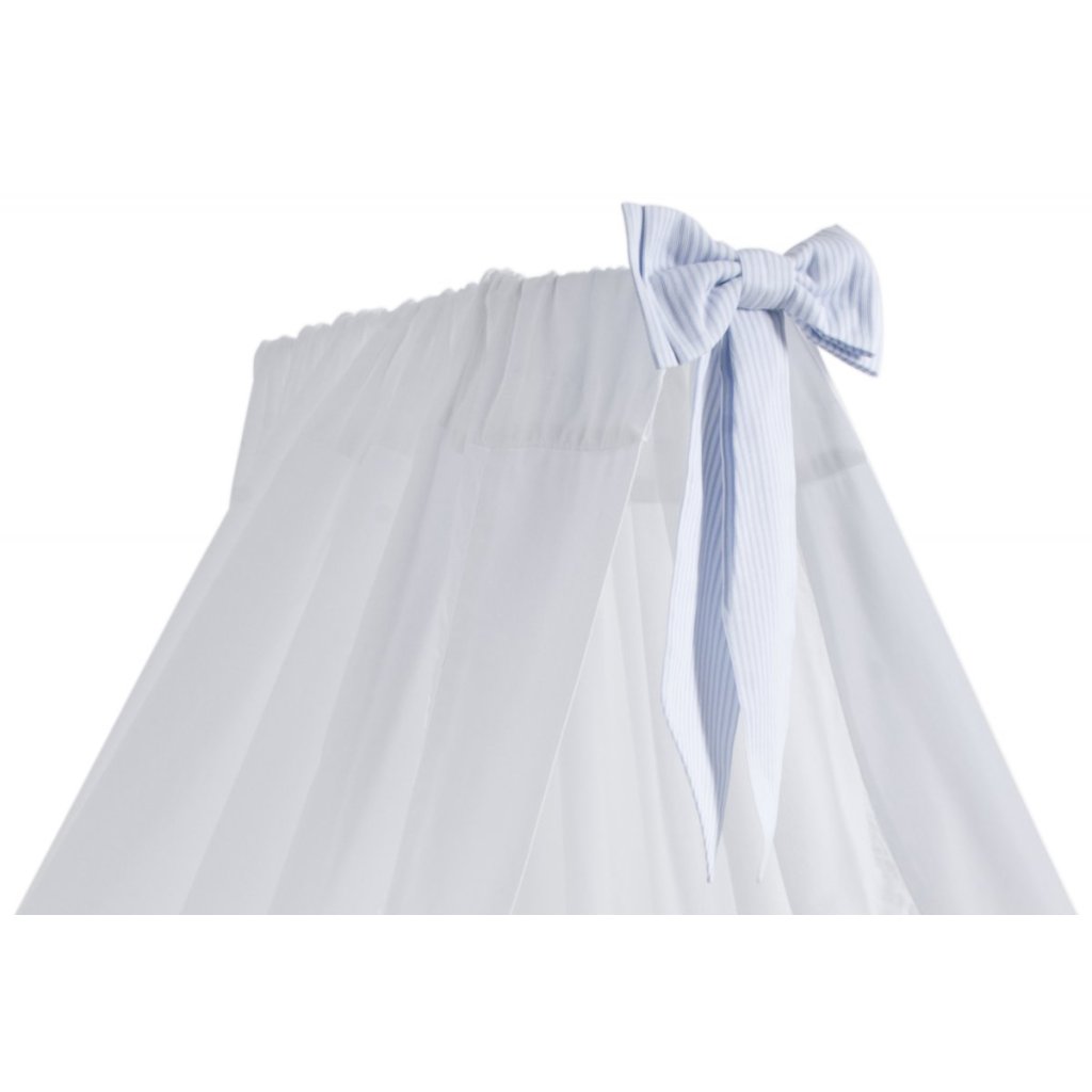 Krásny stojaci baldachýn do detskej izby. Vyrobený z bielej saténovej bavlny a ozdobený mašličkou v baby modrej farbe. Baldachýn je elegantný doplnok, ktorý zútulní detskú postieľku a bábätko sa bude cítiť bezpečnejšie.