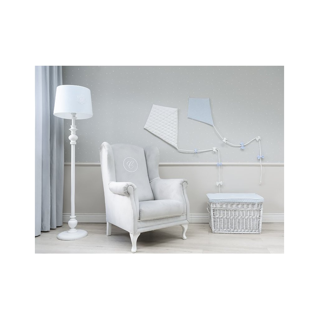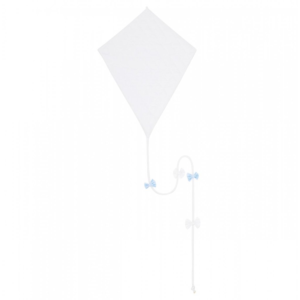 Krásny ručne vyrobený šarkan vyrobený z kvalitného bieleho vinného textilu. Jeho špagát je ozdobený rozkošnými mašličkami v modro-bielej farbe. Šarkan je originálna dekorácia do detskej izbičky.