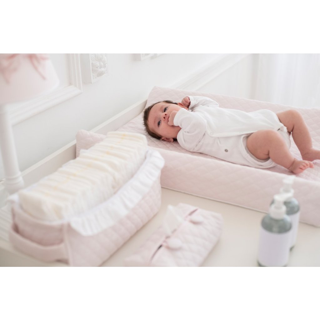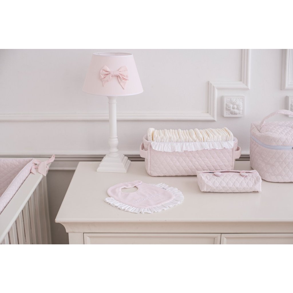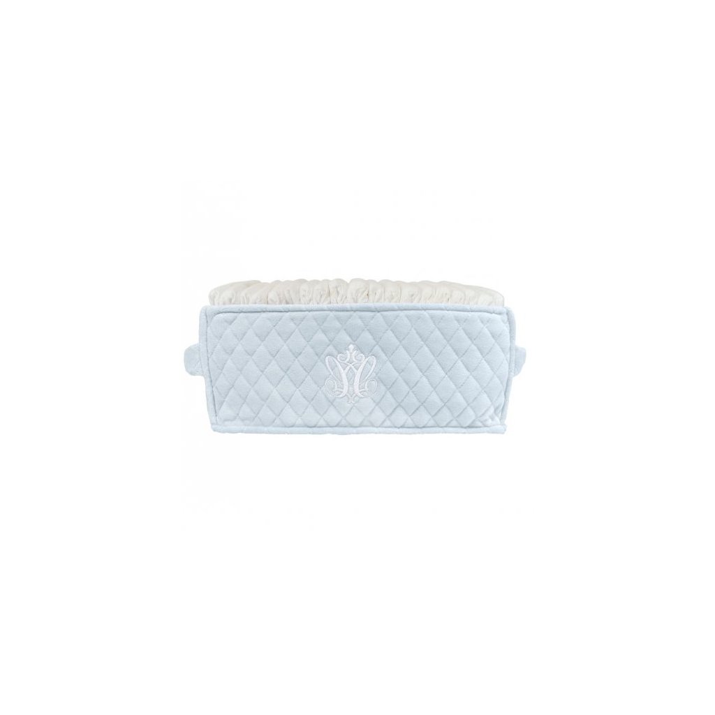 Krásny a funkčný box na plienky vyrobený z prešívanej bavlny v modrej farbe a ozdobený rozkošným volánom. Jej tvar je prispôsobený tvaru a veľkosti plienok.
