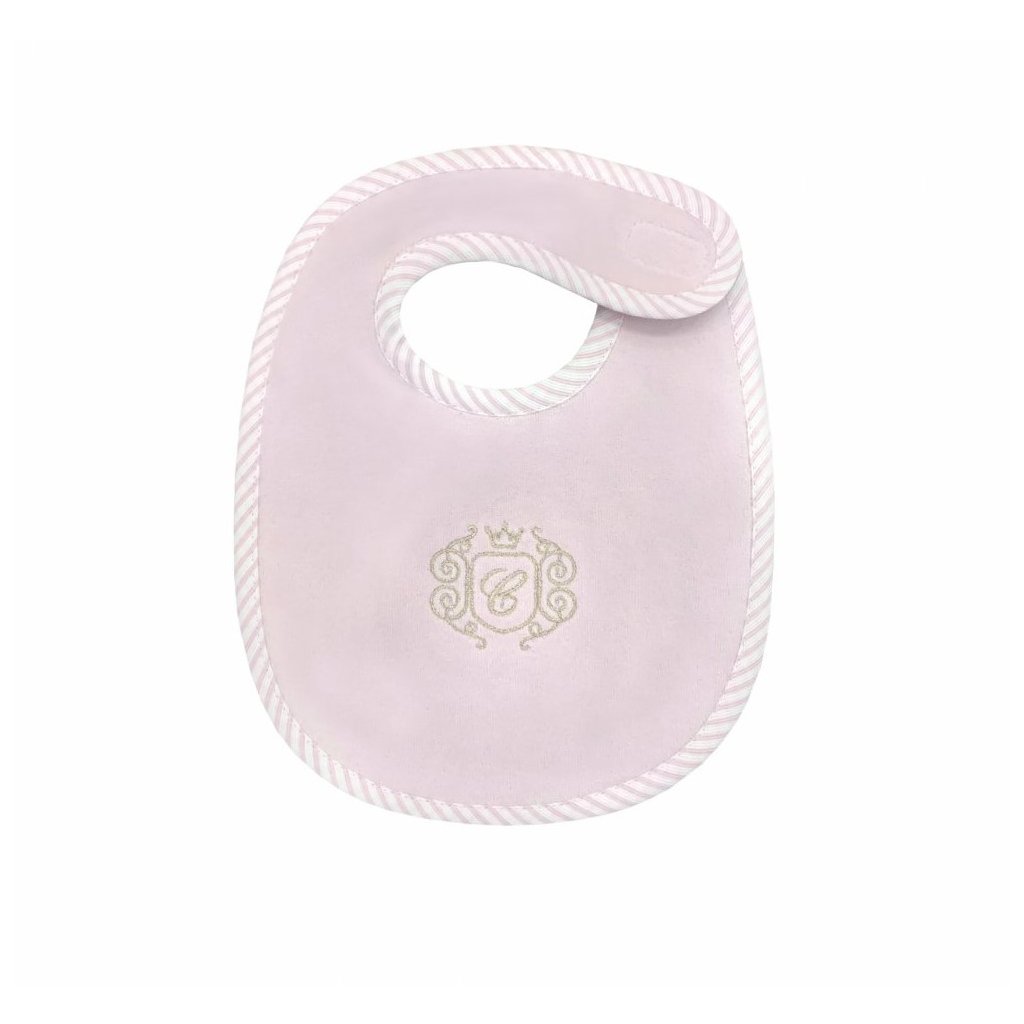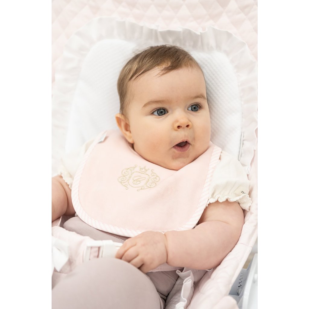 Praktický detský podbradník z jemného ružového velúru, ktorý sa bude páčiť každému malému bábätku. Zapína sa na suchý zips a zdobený je zlatou výšivkou.