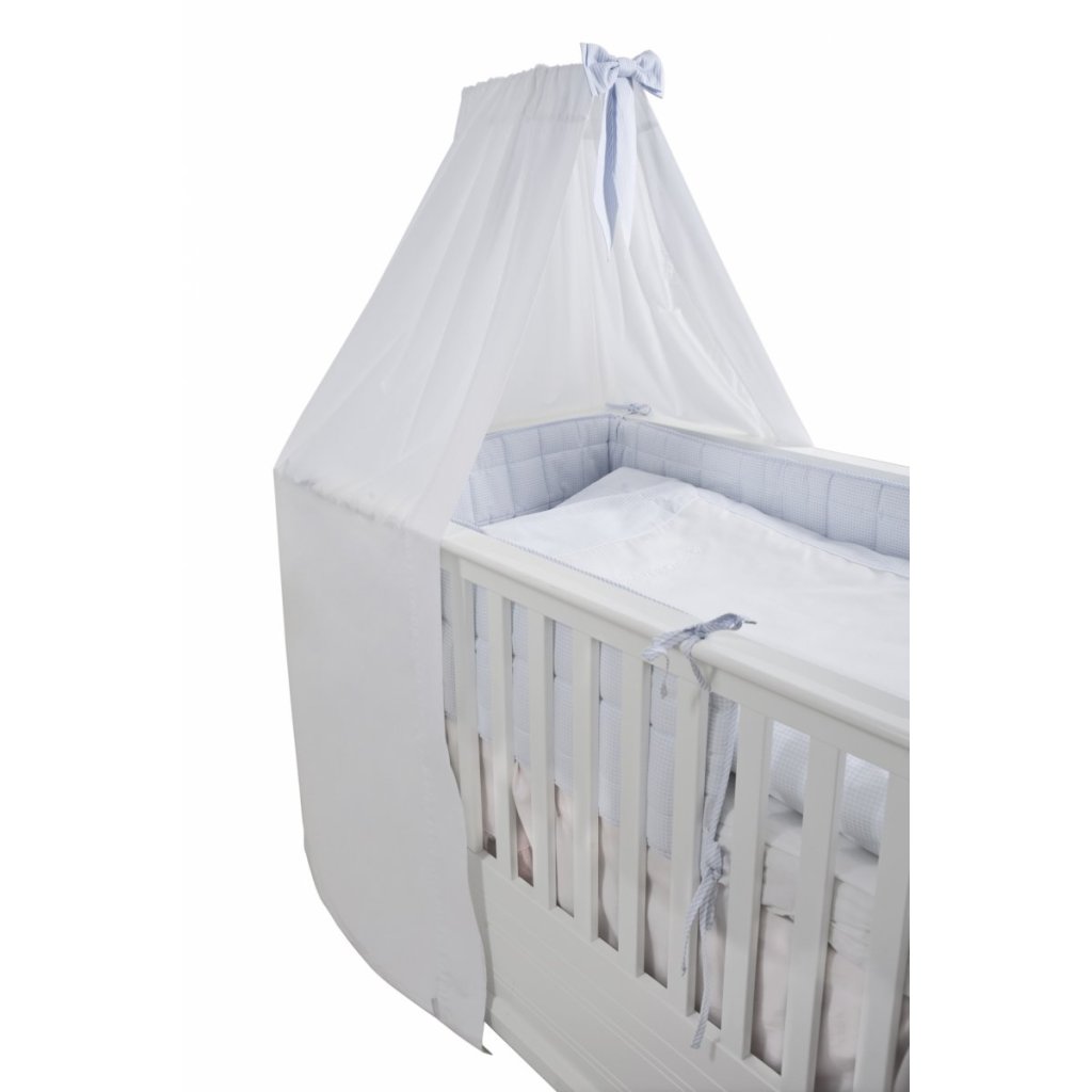 Krásny stojaci baldachýn do detskej izby. Vyrobený z bielej saténovej bavlny a ozdobený mašličkou v béžovej farbe. Baldachýn je elegantný doplnok, ktorý zútulní detskú postieľku a bábätko sa bude cítiť bezpečnejšie.