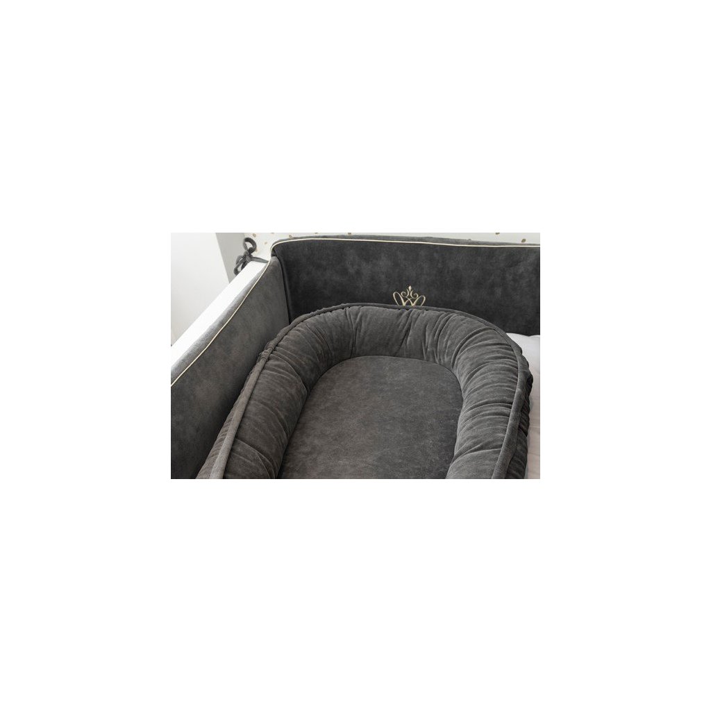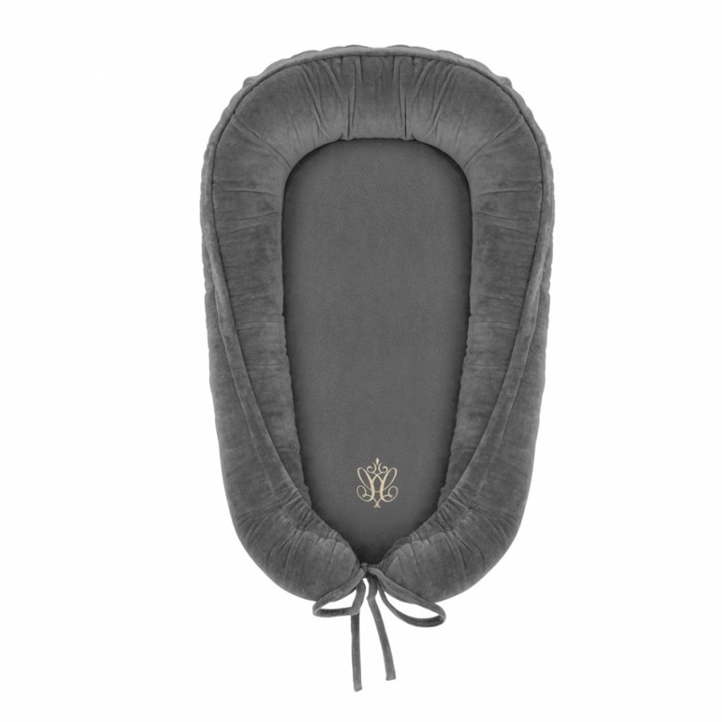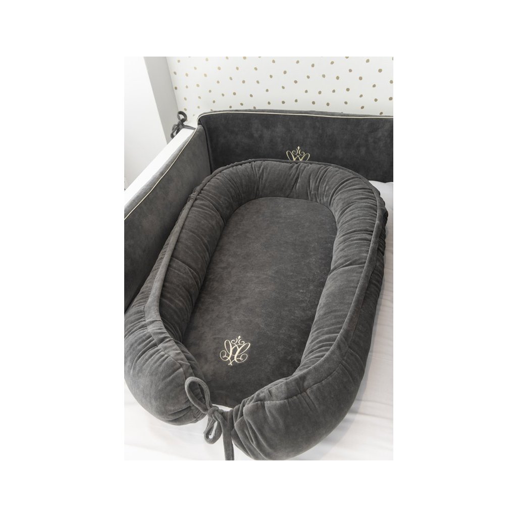 Elegantné a funkčné hniezdo pre bábätko. Skladá sa z krytu a odnímateľnej vložky. Poťah je vyrobený z velúru príjemnej na dotyk antracitovej farby. Môže byť použitý v rodičovskej posteli, na podlahe alebo na gauči. Ideálne pre deti vo veku do 6 mesiacov.