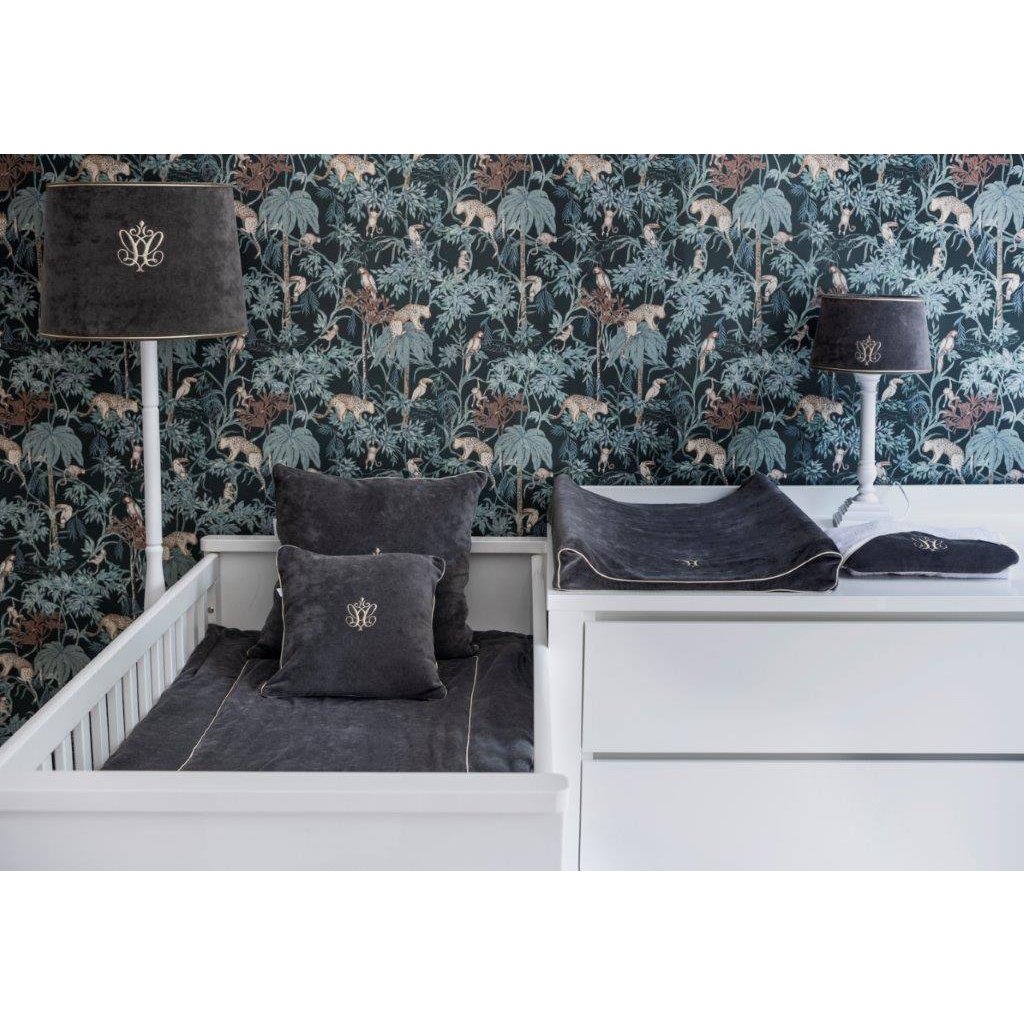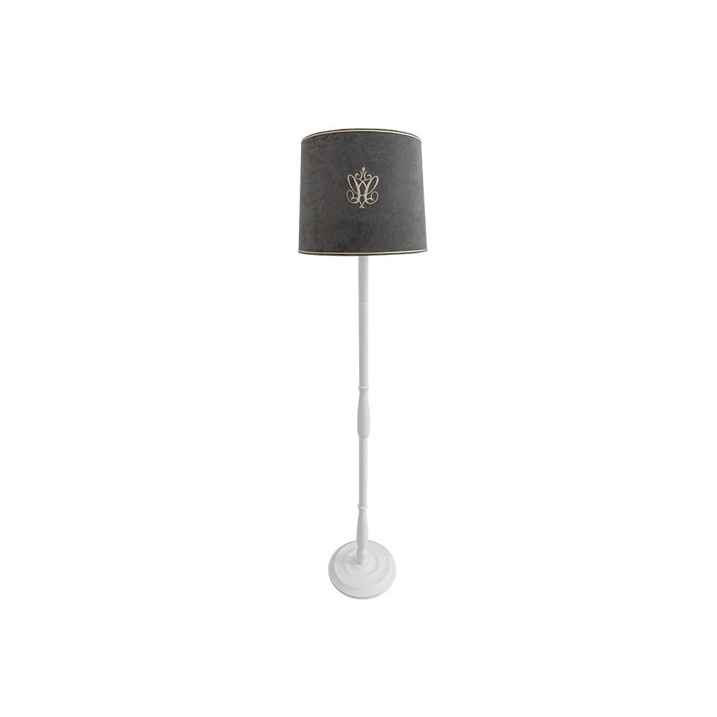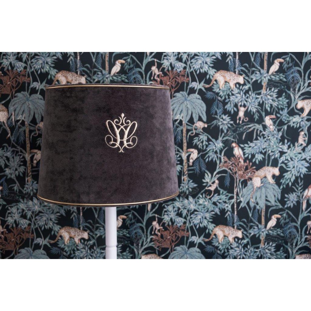 Krásny dizajn - stojacia lampa. Tienidlo vyrobené z velúru antracitovej farby, zdobené zlatou ozdobnou páskou a zlatou výšivkou. Veľká izbová lampa s elegantnou drevenou nohou sa bude hodiť do každej detskej izby.