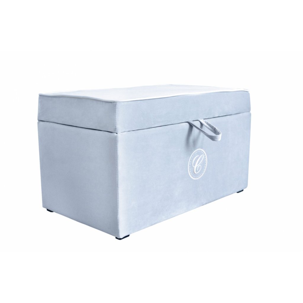 Elegantný a funkčný čalúnený box na hračky s kvalitnou umývateľnou textíliou v bledomodrej farbe. Je zdobený bielym lemovaním a exkluzívnym bielym znakom. Veľmi priestranný box vám pomôže uložiť hračky a iné doplnky v detskej izbe.