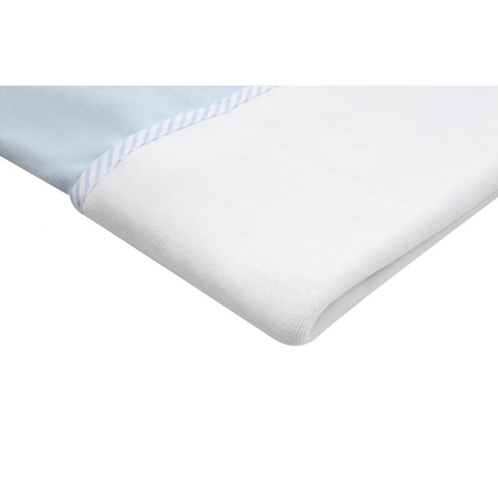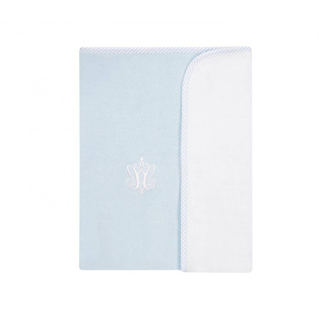 Elegantná obojstranná velúrová deka - z jednej strany bledomodrá a z druhej biela. Zdobená štýlovým emblémom. Bude skvelým doplnkom výbavičky pre chlapčeka a dobrým nápadom na darček pre dieťa. Balené v elegantnej krabičke.