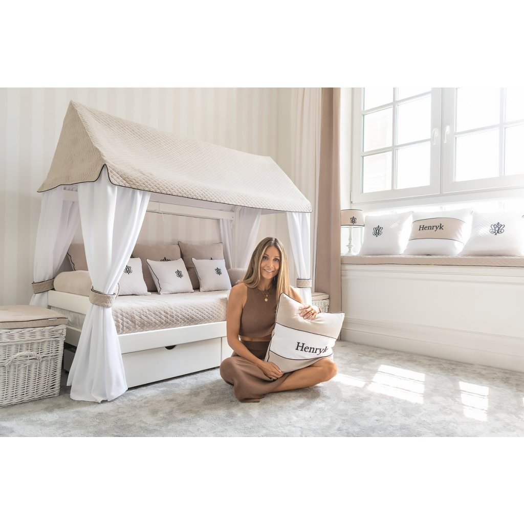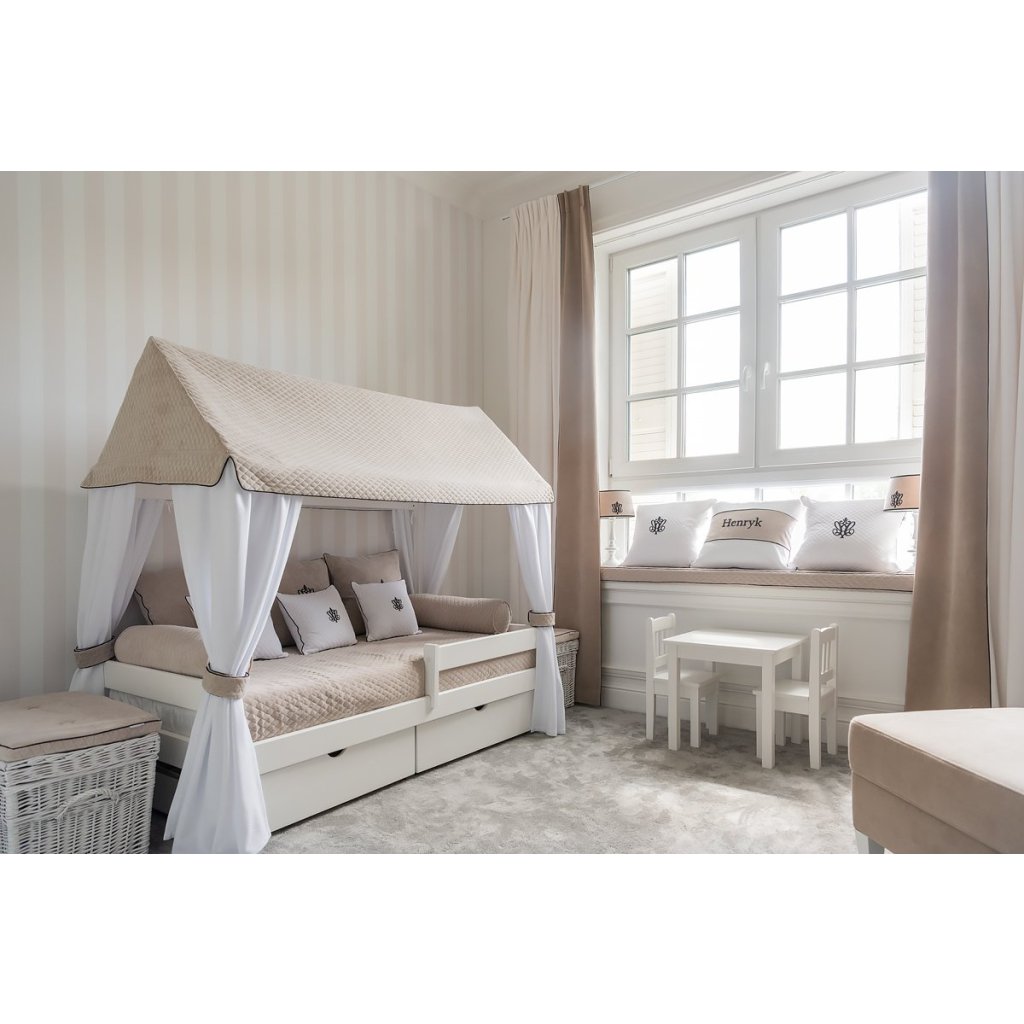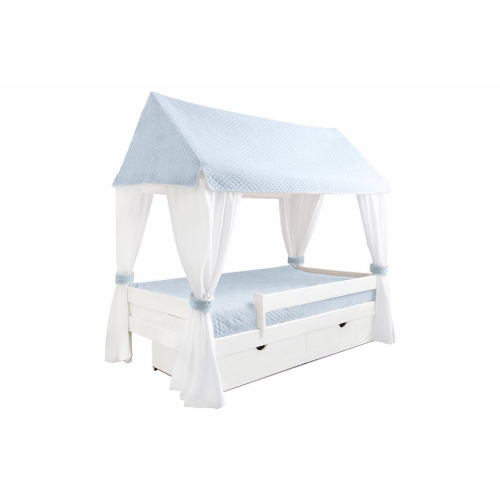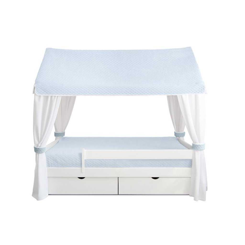 Úžasná posteľ v tvare domčeka. Posteľ vytvorí v izbe jedinečnú atmosféru. Strieška je vyrobená z modrého prešívaného bavlneného materiálu a „steny“ sú vyrobené z jemného bieleho textilu, zdobeného dvoma očarujúcimi mašličkami. Rozmer matraca 160 x 80 cm.