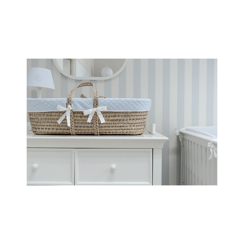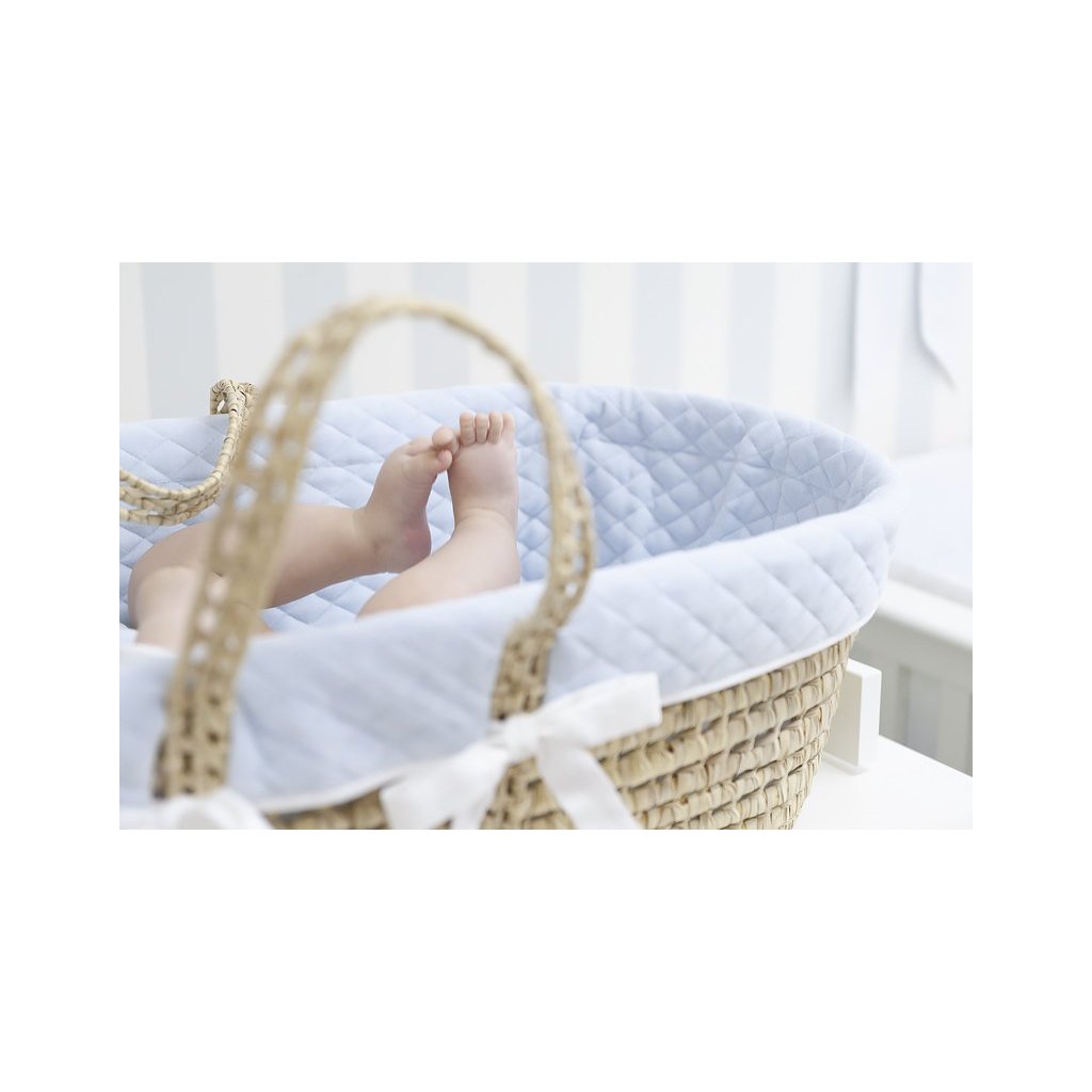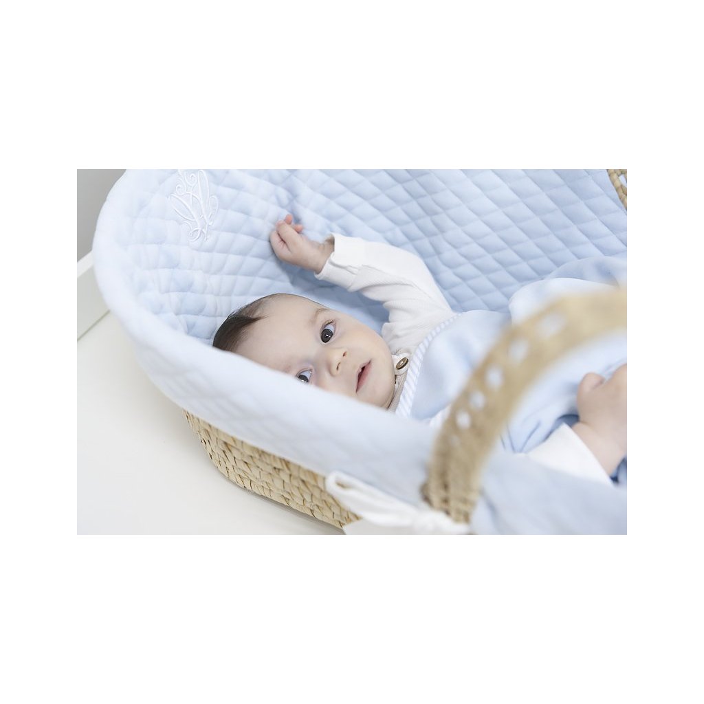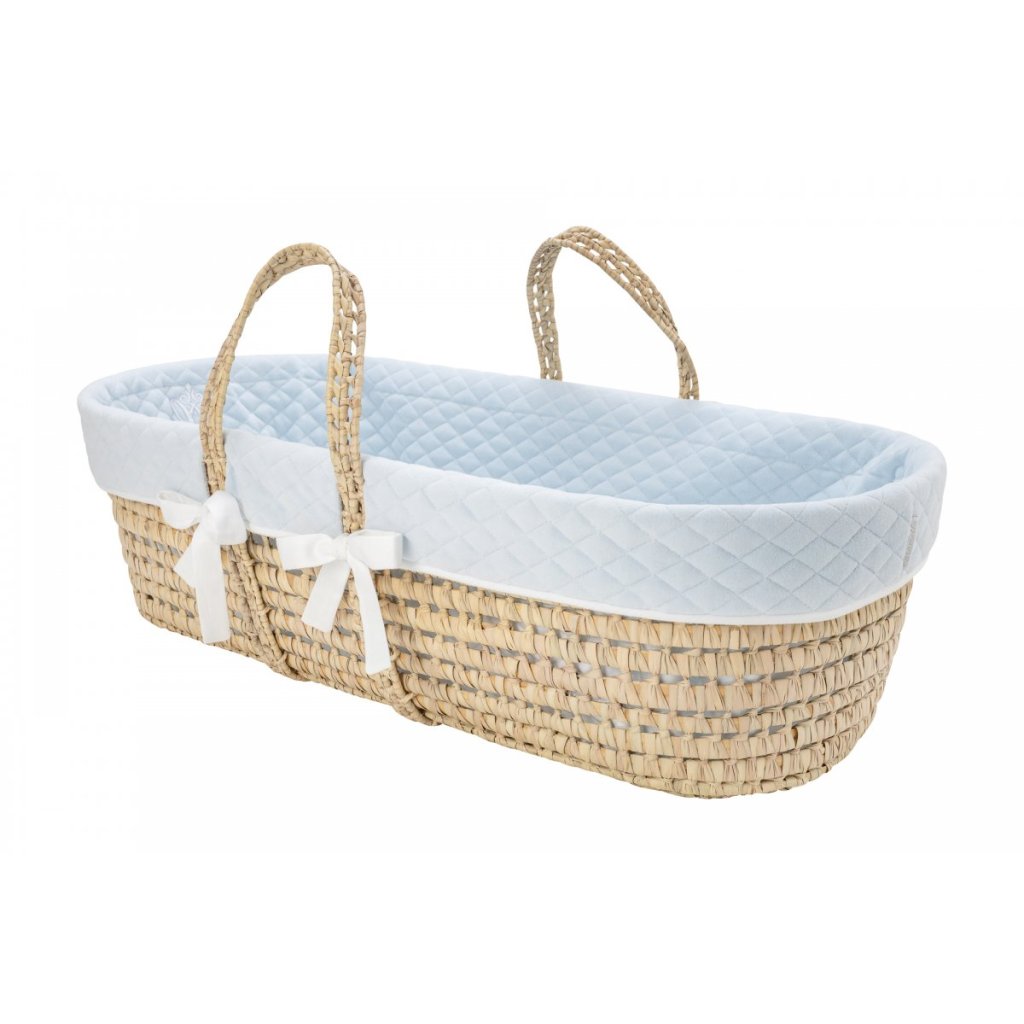 Rozkošný kôš Mojžiš vyrobený z palmových listov bezpečný pre dieťa. Má prešívanú bavlnenú textilnú podšívku v modrej farbe (zaväzuje sa malými ramienkami) a v spodnej časti má oválny piškótový matrac.