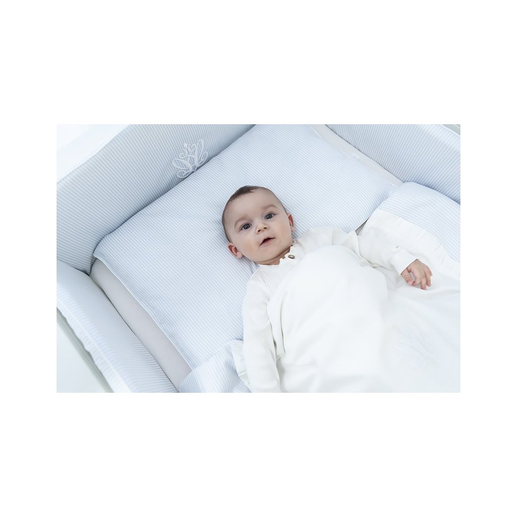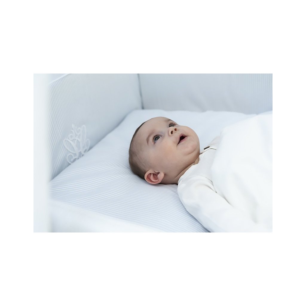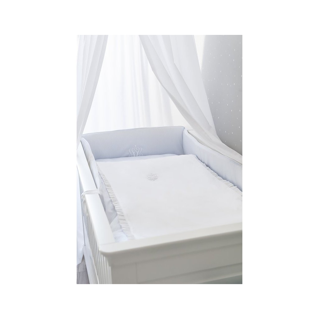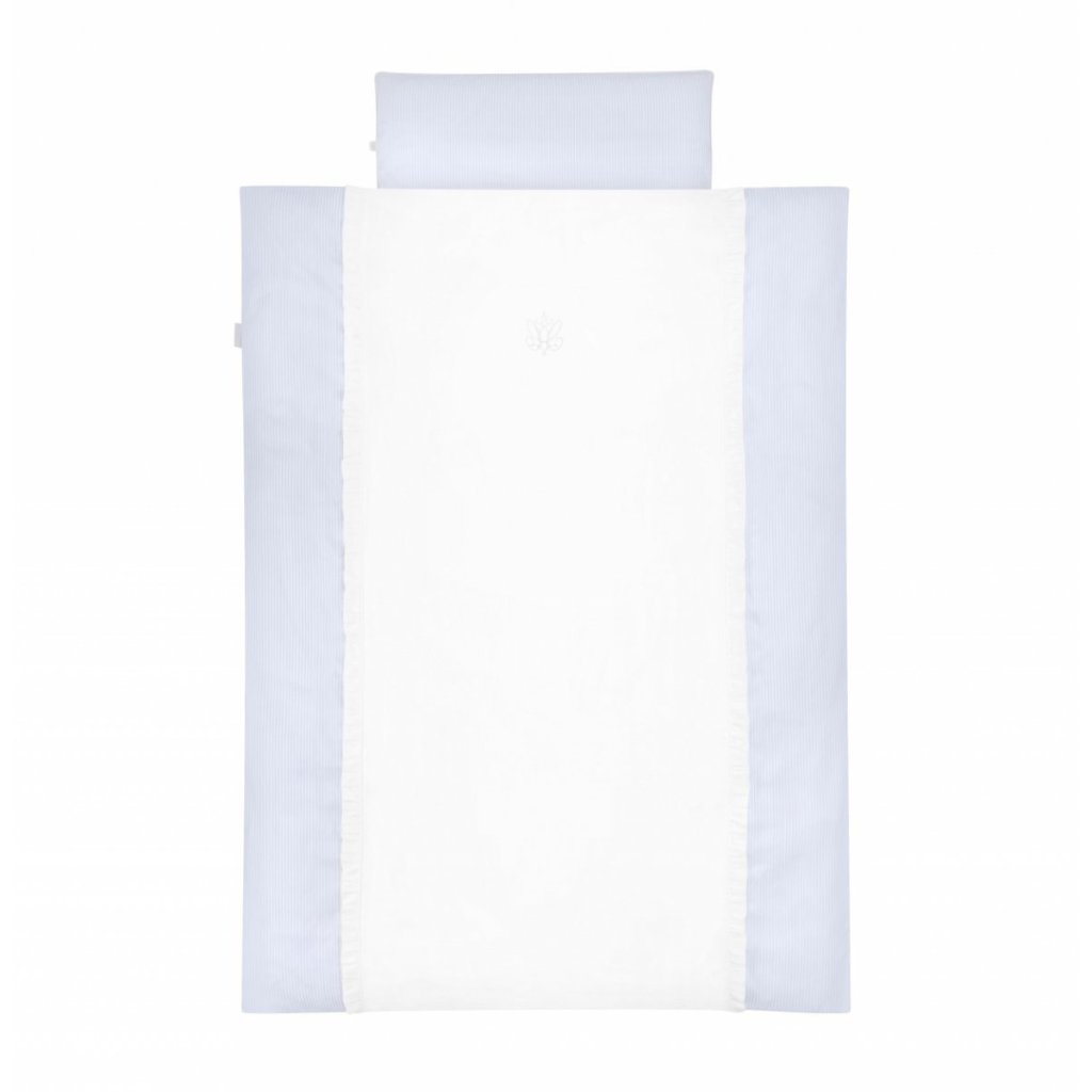 Klasická chlapčenská kompozícia azúrových a bielych farieb. Hladká bavlna je kombinovaná s jemnými bielymi a modrými prúžkami. Posteľná bielizeň je navyše ozdobená elegantnou trojrozmernou výšivkou.
