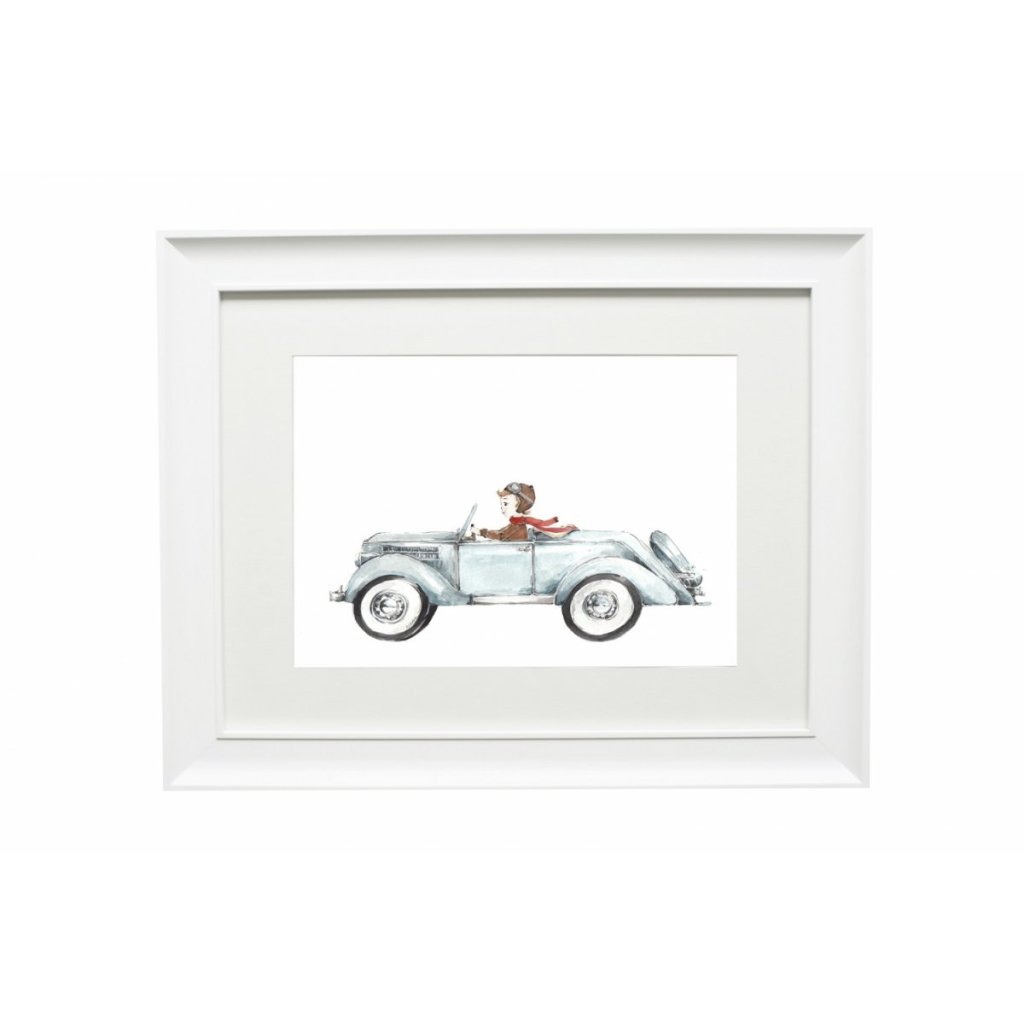 Krásny obrázok chlapca, ktorý jazdí v aute. Pevný elegantný rám je vyrobený z dreva.