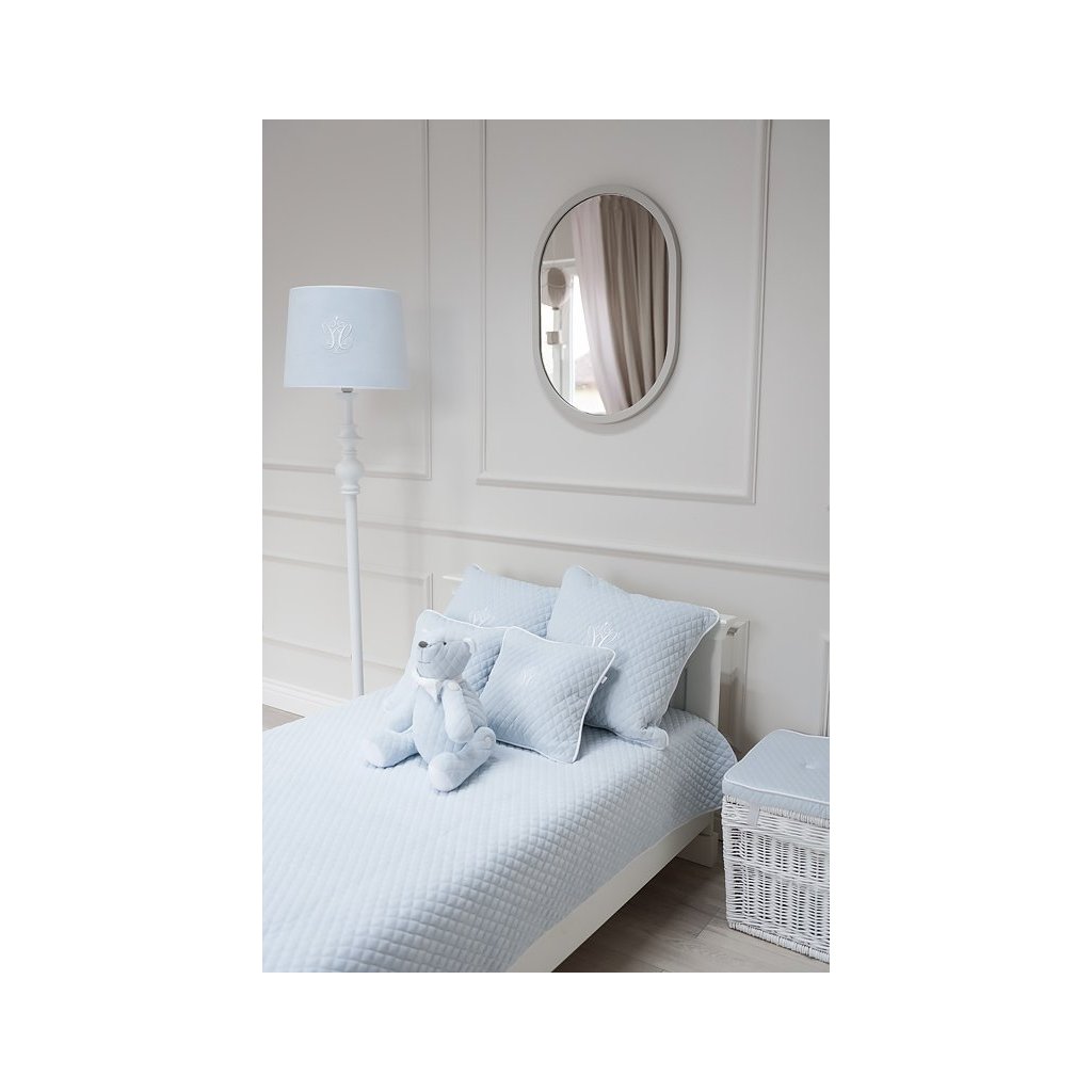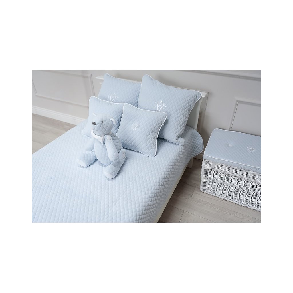 Krásny prešívaný prehoz na posteľ z jemného bledomodrého velúru. Vďaka svojej tuhej štruktúre prehoz dokonale pokryje posteľ. Odporúčame si dokúpiť dekoračné vankúšiky v rovnakom dizajne a vytvoriť tak dokonale zloženú dekoračnú sadu na posteľ vášho dieťaťa.