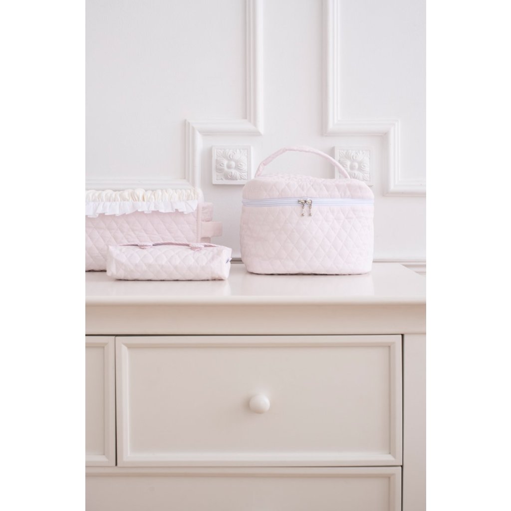 Veľký a veľmi priestranný kozmetický kufrík ideálny na prenášanie všetkých detských hygienických produktov. Je vyrobený z prešívanej bavlny v modrej farbe a vybavený zipsom.