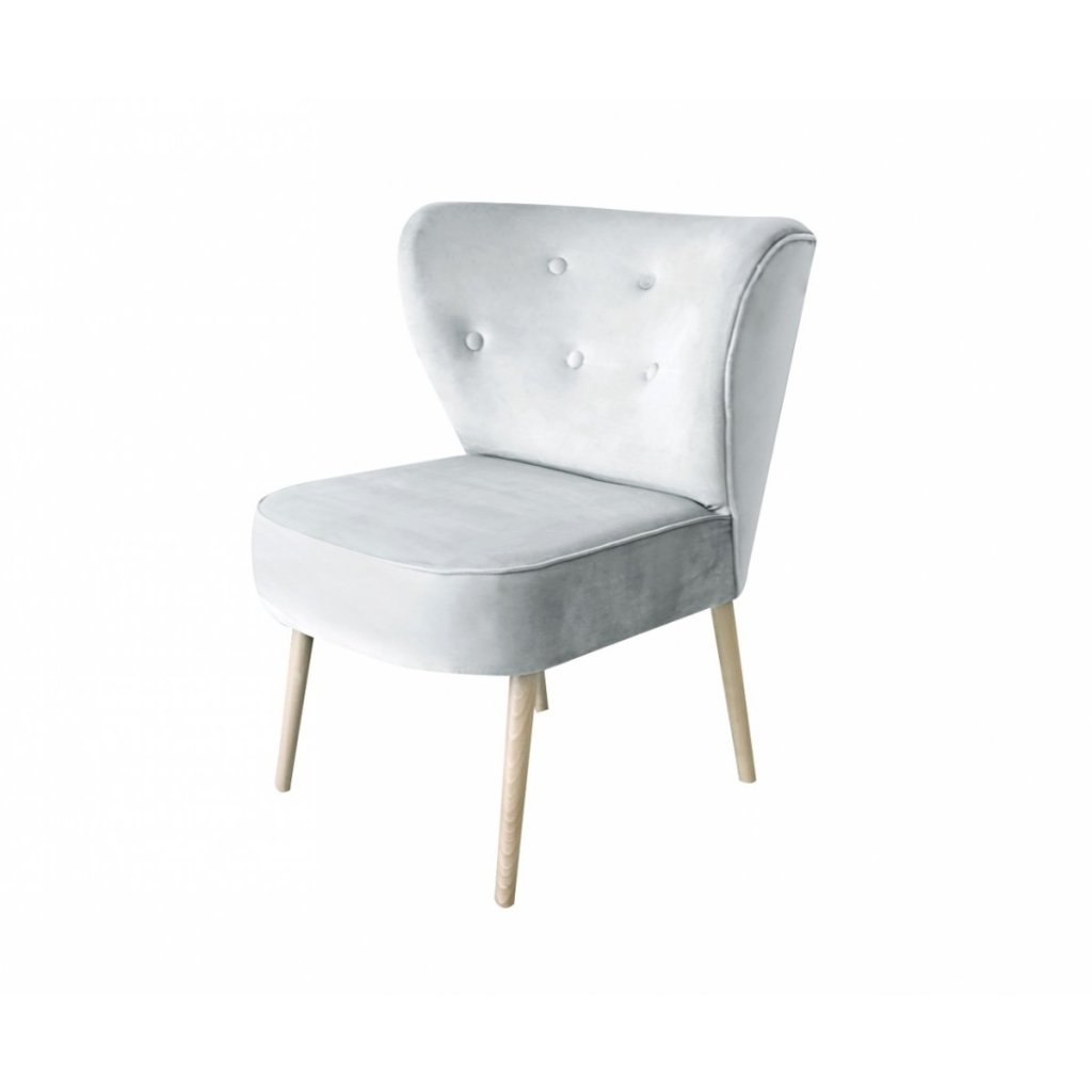 Krásna a štýlová stolička v retro štýle vyrobená z kvalitného prateľného zamatového textilu v šedomodrom odtieni. Nohy sú matné a vyrobené z bukového dreva. Operadlo kresla je zdobené jemným prešívaním a gombíkmi. Tento nábytok dokonale vyzerá v interiéroch v škandinávskom štýle až po tie moderné.