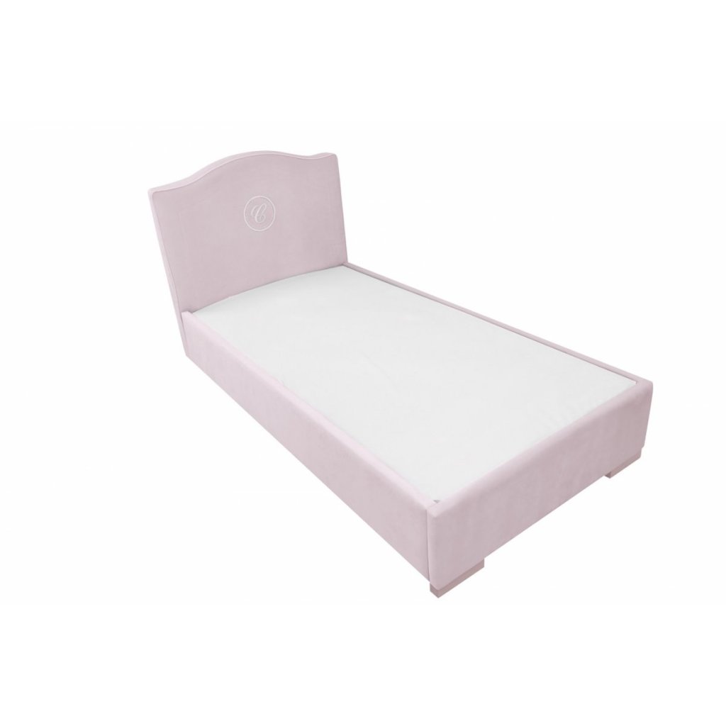 Elegantná detská posteľ s exkluzívnou výšivkou s písmenom „C“. Čelo postele a rám sú čalúnené kvalitnou umývateľnou textíliou vo farbe ružová, vďaka čomu je nábytok ešte funkčnejší.