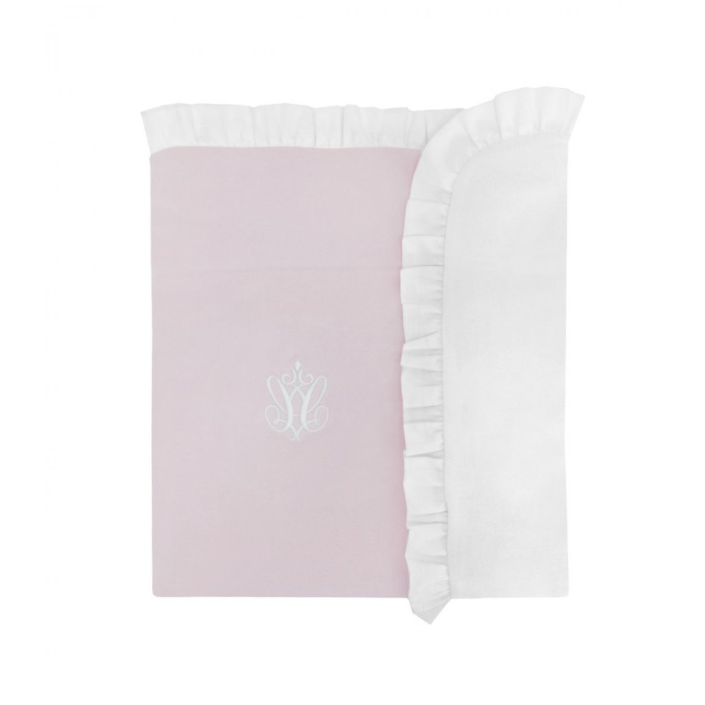 Očarujúca velúrová deka v jemnej púdrovej ružovej farbe. Zdobená ozdobným volánom a štýlovým emblémom. Bude skvelým doplnkom výbavičky pre dievčatko a dobrým nápadom na darček pre dieťa. Balené v elegantnej krabičke.