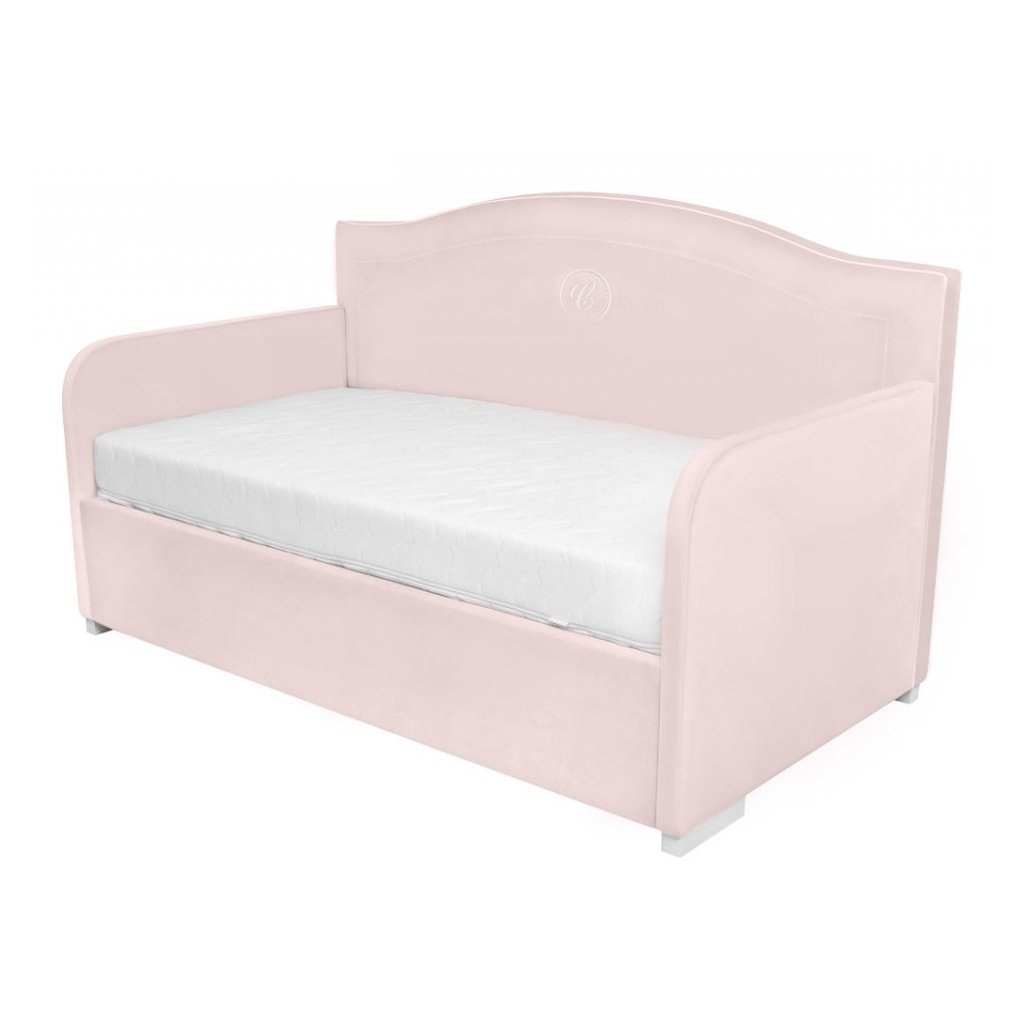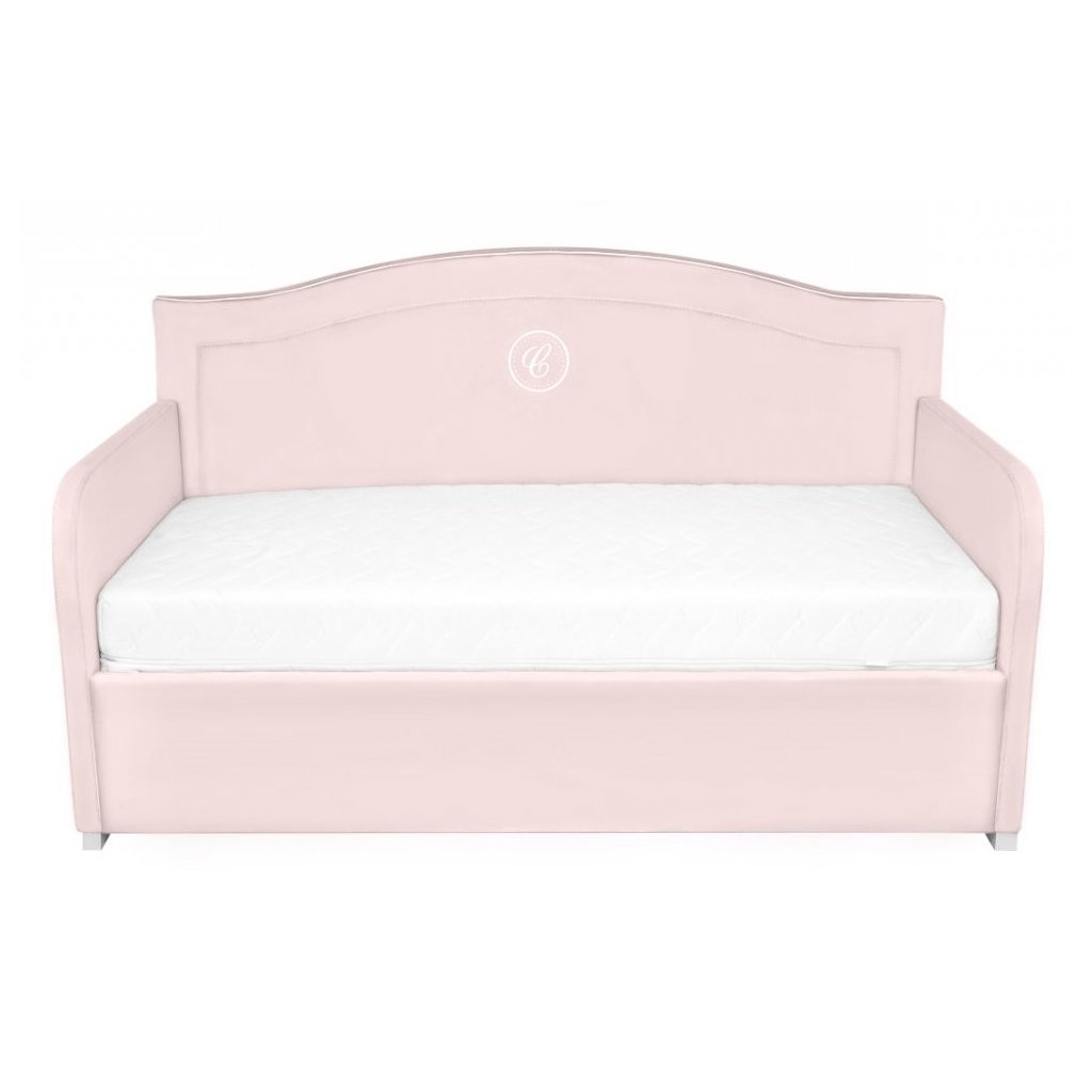Elegantná čalúnená detská posteľ, zdobená exkluzívnou výšivkou s písmenom "C". Vyrobené z kvalitnej umývateľnej látky v ružovej farbe, vďaka ktorej je nábytok odolný voči akémukoľvek znečisteniu. Čelo postele je ukončené ozdobnou vlnkou a bielou vsadkou. Je veľmi pohodlná a jej tvar vám umožňuje použiť ju aj ako pohovku. Posteľ je možné objednať s úložným priestorom.
