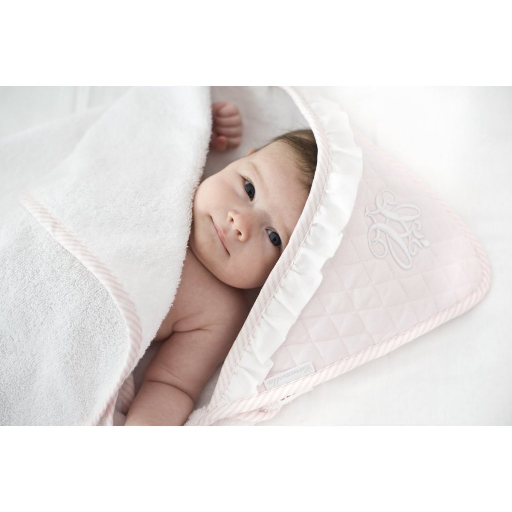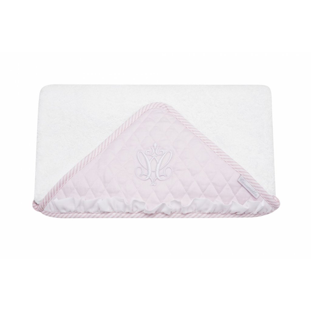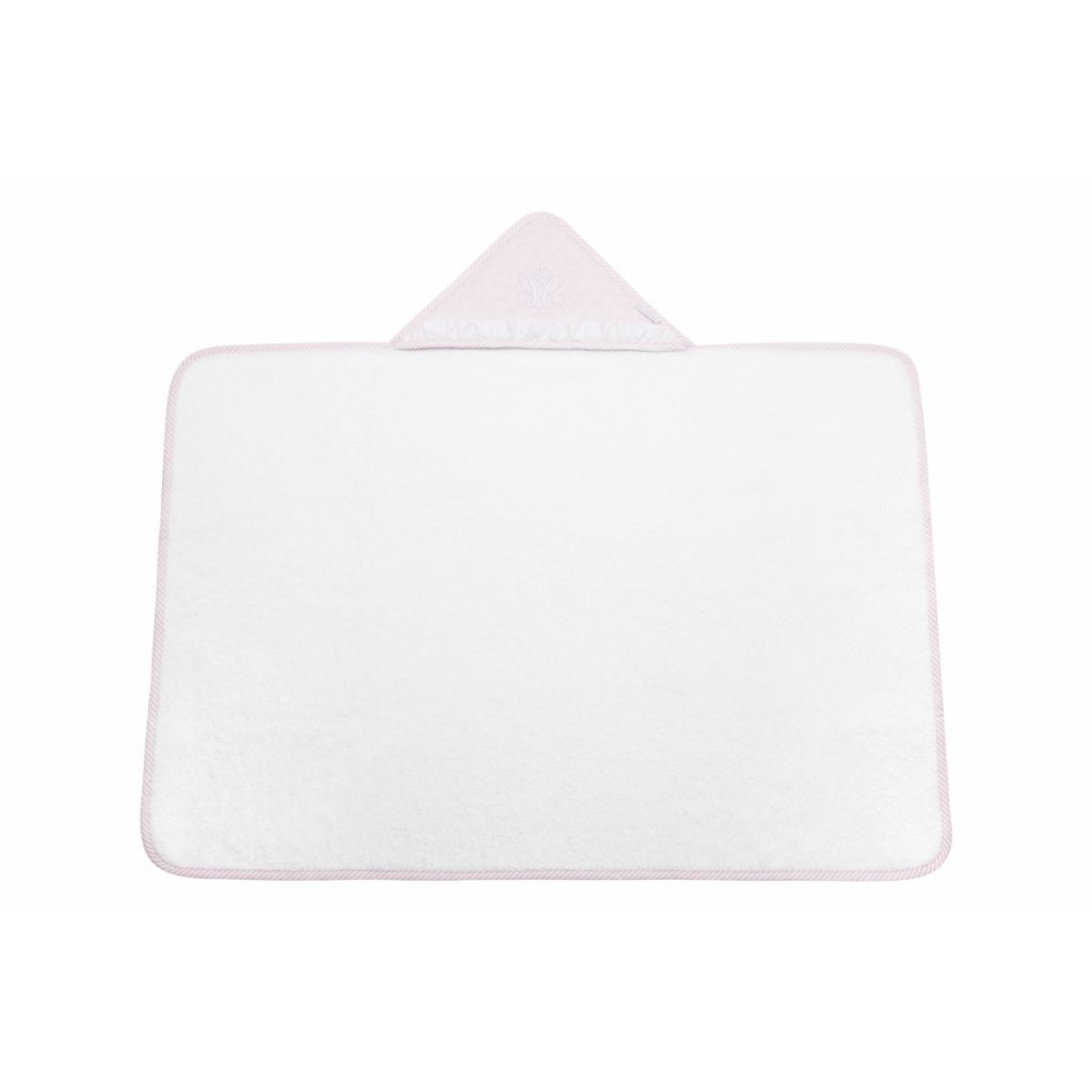 Elegantná osuška vyrobená z bielej froté látky. Bledoružová kapucňa je ozdobená elegantným bielym znakom a ukončená bielym riasením. Veľkosť osušky je väčšia, než je bežne dostupné na trhu. Osušku tak môže používať malé aj staršie dieťa. Preto ju budete používať veľmi dlho. Ideálna ako darček.