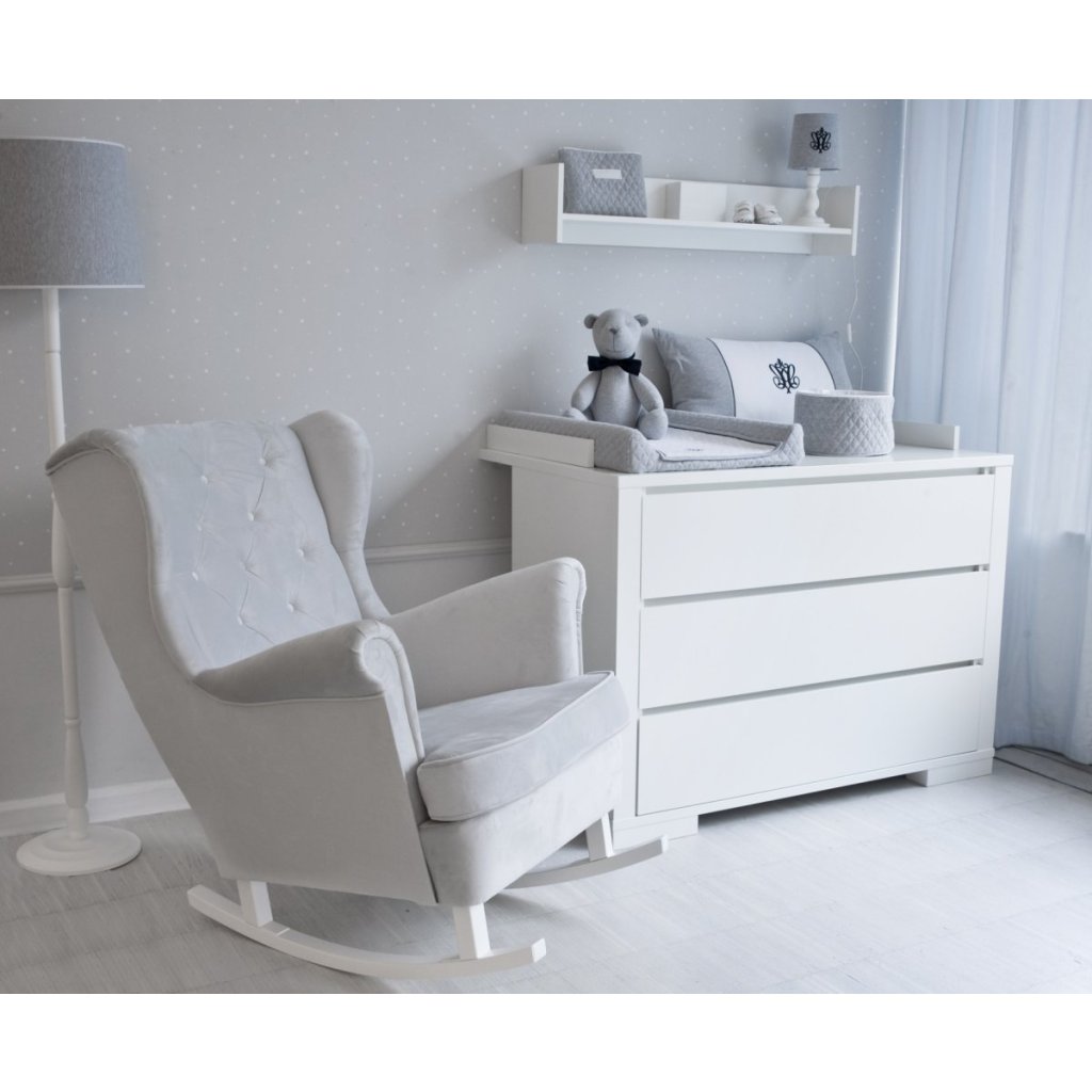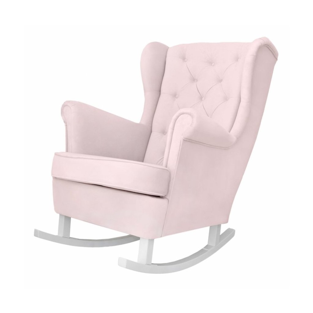 Elegantné, štylizované hojdacie kreslo potiahnuté kvalitným umývateľným textilom v bledoružovej farbe. Dostupné vo viacerých farbách: bledoružová, modrá a béžová