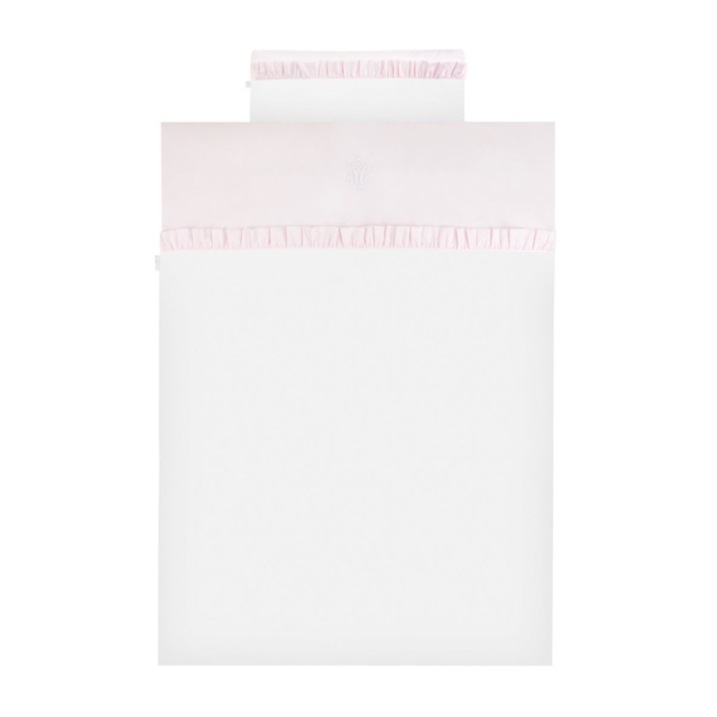 Krásne dievčenské posteľné prádlo zložené z elegantného bieleho bavlneného textilu s elegantnými ružovými prvkami. Obliečku na vankúš a paplón zdobí rozkošný volán. Obliečky sú zdobené elegantnou bielou výšivkou. Výrobok môže byť dokonalým darčekom - posteľná bielizeň je zabalená v ozdobnej škatuli.