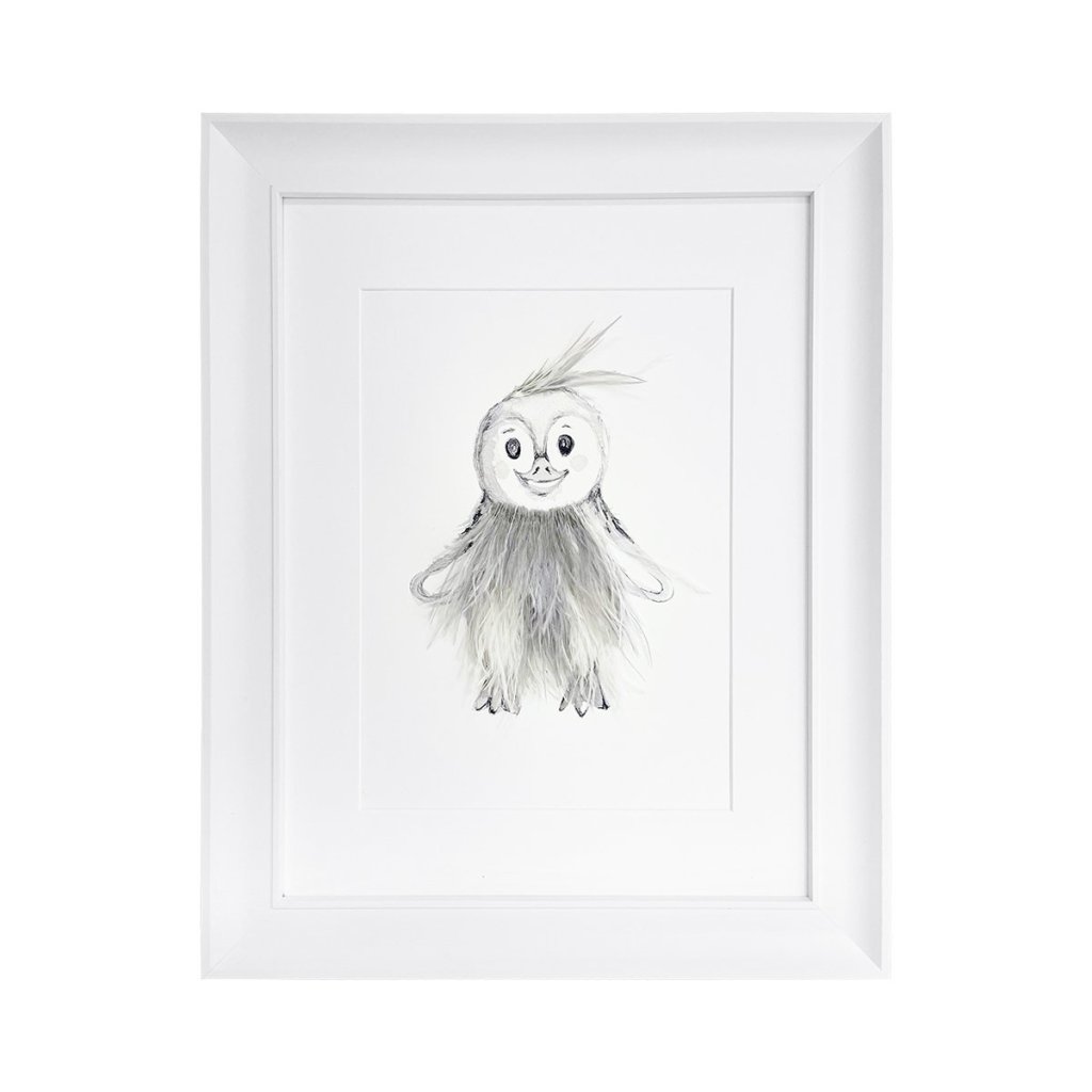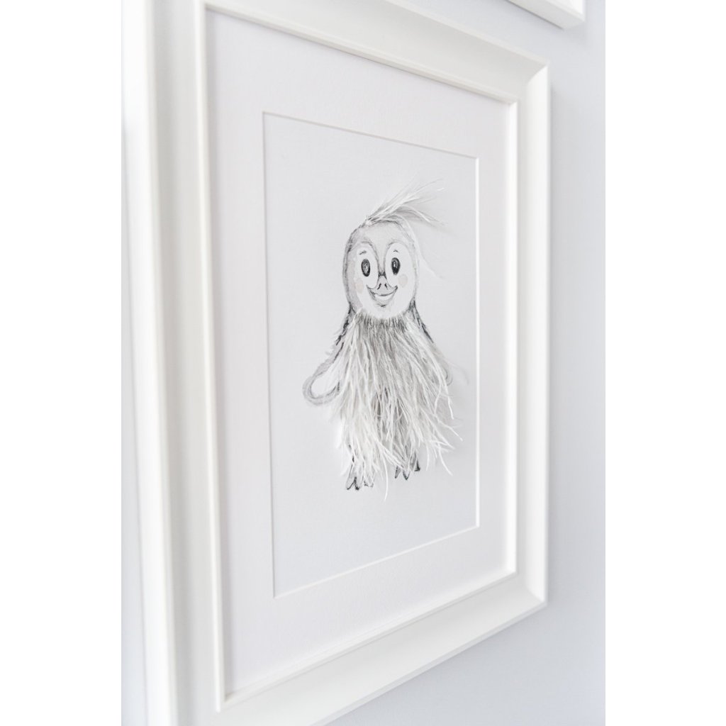 Krásny trojrozmerný textilný obrázok s motívom tučniačik, dotvorený prírodnými pierkami. Zvýraznený dreveným bielym rámom.