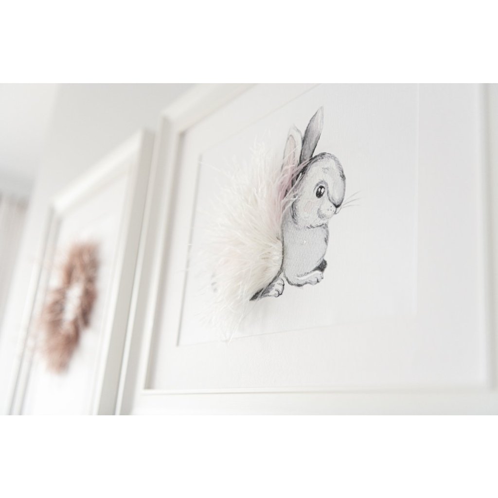 Krásny trojrozmerný textilný obrázok s motívom zajačik, dotvorený prírodnými pierkami. Zvýraznený dreveným bielym rámom.
