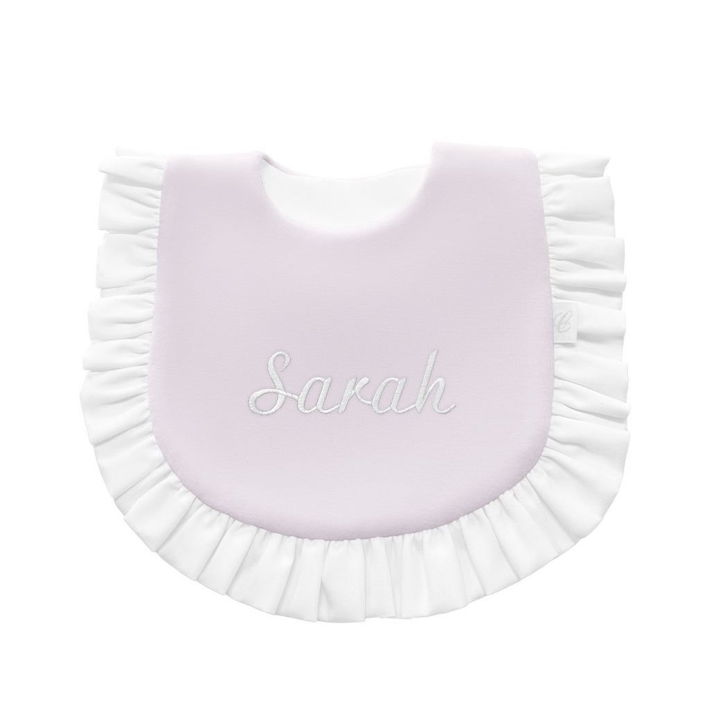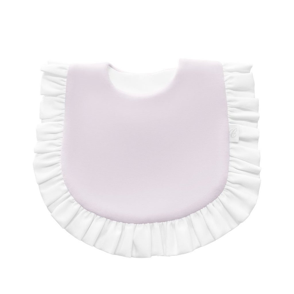 Praktický detský podbradník z jemného ružového velúru, ktorý poteší každé malé bábätko. Zapínanie na suchý zips a zdobené rozkošným volánom.