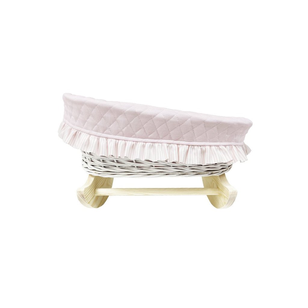 Krásna prútená kolíska s bielymi a ružovými prvkami. Je ručne vyrobená z najkvalitnejšieho prútia, lakovaná bielou farbou a ozdobená bielym bavlneným volánom a vnútro ružovou časťou.