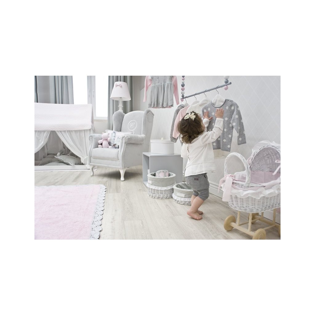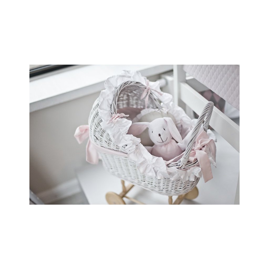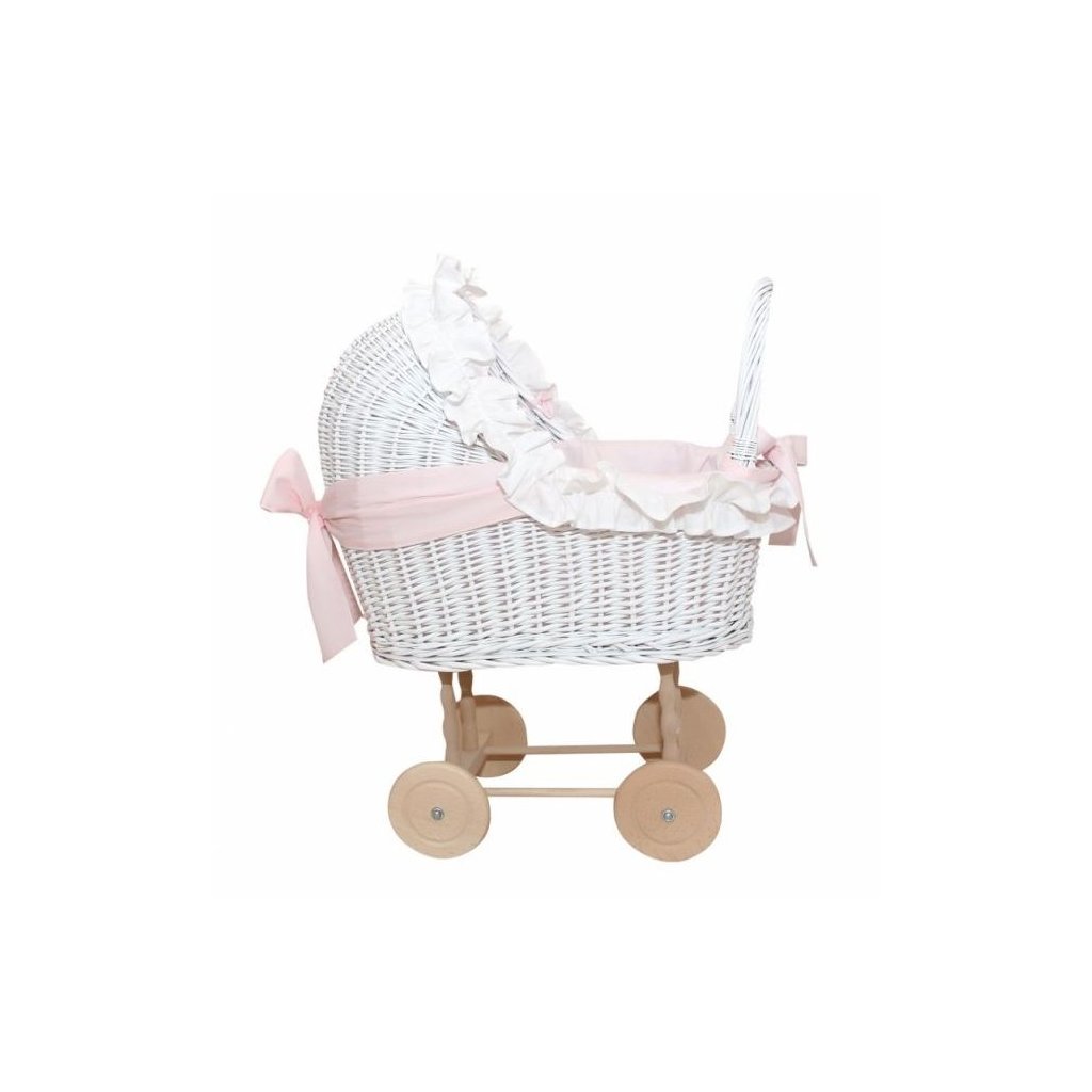 Krásny prútený kočík s bielymi a bledoružovými prvkami. Je ručne vyrobený z najkvalitnejšieho prútia, lakovaného na bielo a je ozdobený bielym bavlneným riasením a bledoružovou vnútornou časťou. Veľmi krásna a atraktívna hračka pre vaše dieťa.