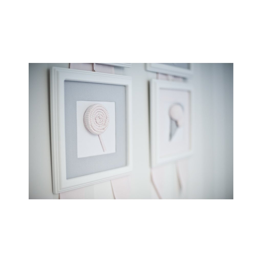 Rozkošná trojrozmerná lízanka v detských ružových a sivých farbách. Vnútorná časť obrázka je vyrobená z textilu.