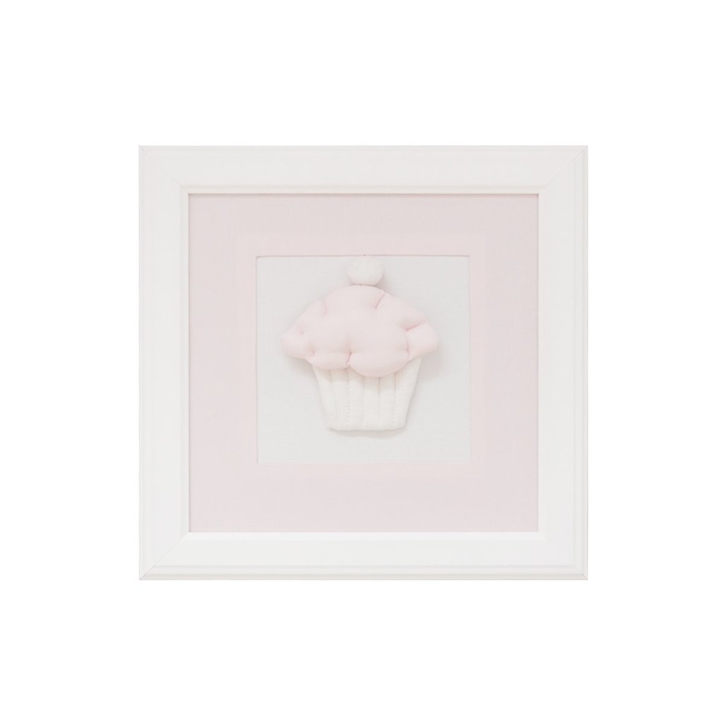 Rozkošný trojrozmerný muffin v baby ružovej a bielej farbe. Vnútorná časť obrazu je vyrobená z textilu. Pasparta je vyrobená z textilu baby pink.