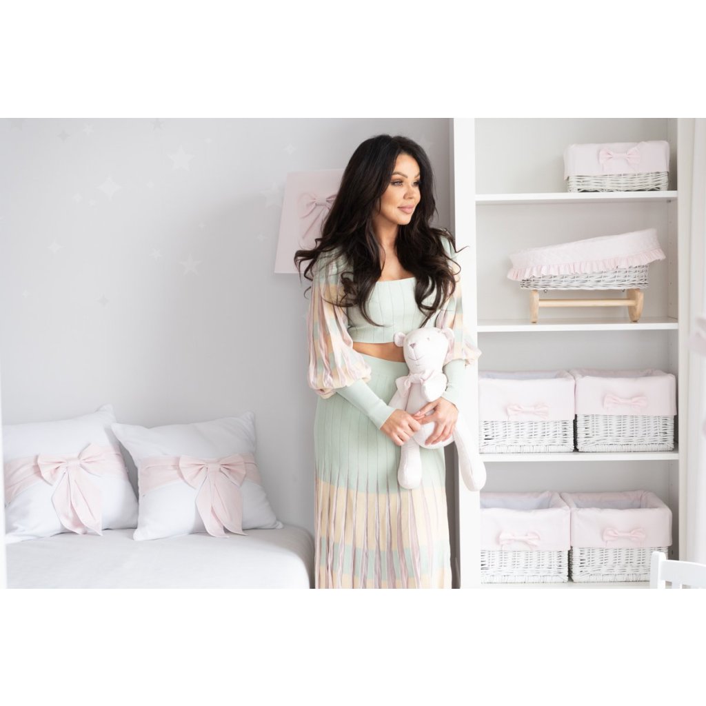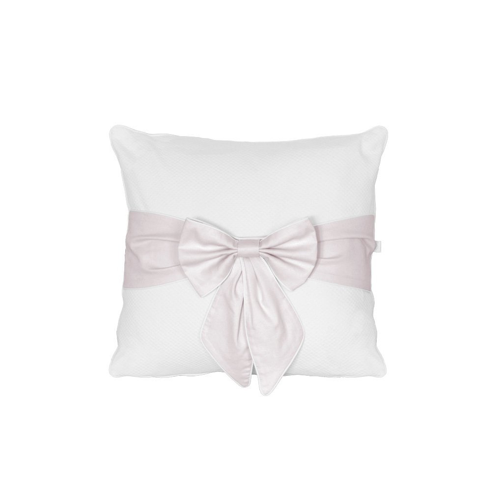 Rozkošný originálny vankúš s veľkou ozdobnou mašľou. Vyrobené z kvalitnej bielej vaflovej látky a bavlny v ružovej farbe.