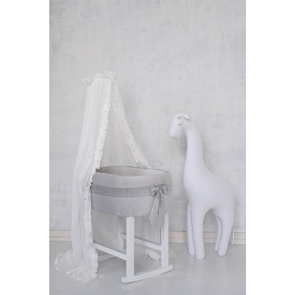 Krásny stojaci baldachýn do detskej izby. Vyrobený z bieleho bavlneného voálu a zdobený volánom. Baldachýn je elegantný doplnok, ktorý zútulní detskú postieľku a bábätko sa bude cítiť bezpečnejšie.