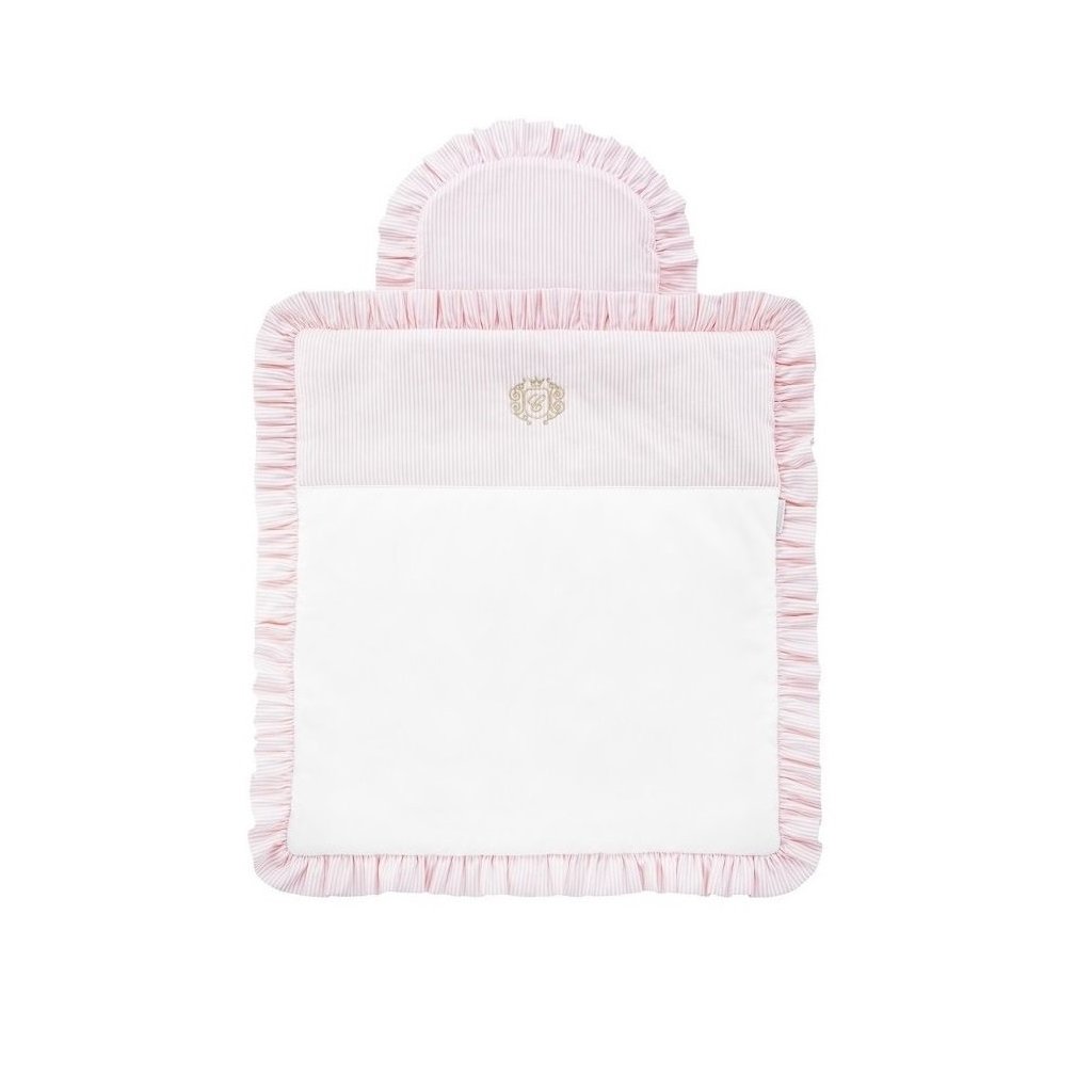 Mini posteľná bielizeň do Mojžišovho košíka. Ideálne aj pre kočík, kolísku a prútený kočík. Vyrobené zo saténovej bavlny. Zdobené zlatým znakom a ukončené krásnym volánom.
