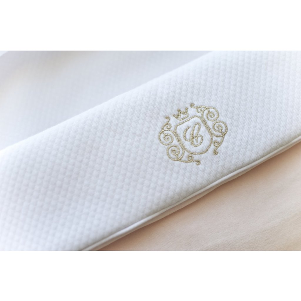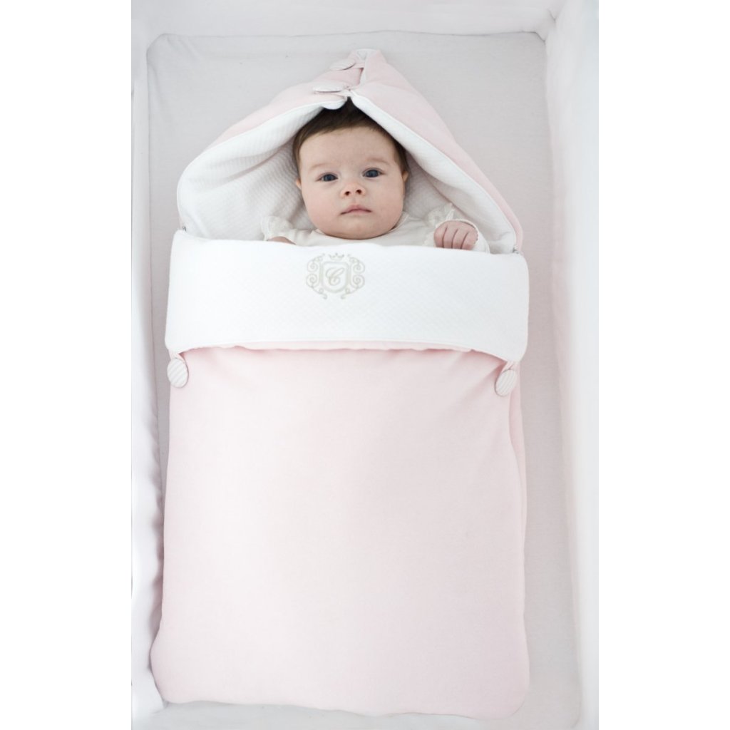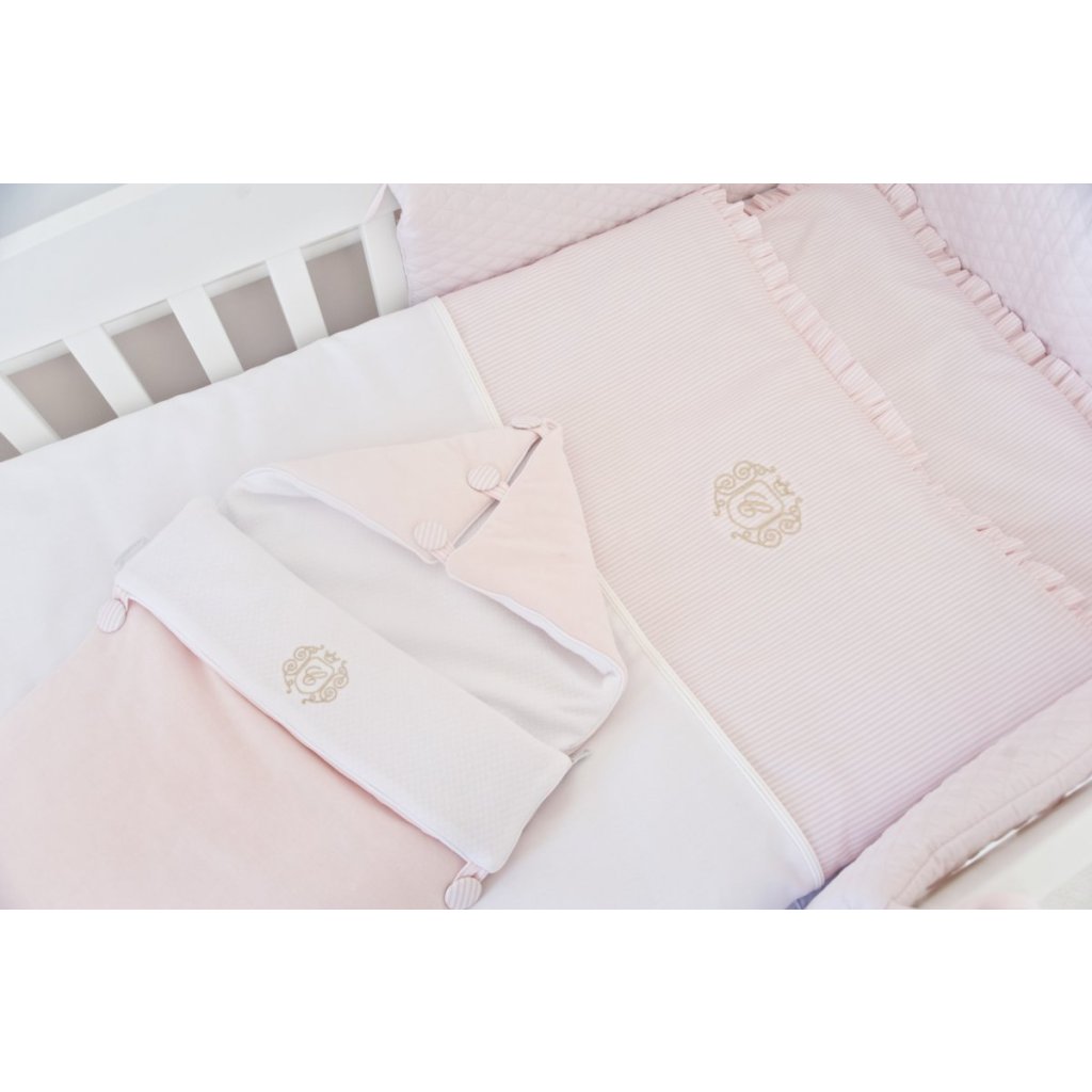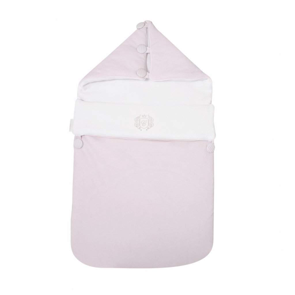 Elegantná perinka vyrobená z jemného ružového zamatu. Jeho vnútorná časť je vyrobená z bavlny v bielej farbe. Perinka je zdobená elegantným zlatým znakom. Táto perinka má kapucňu na gombíky a po rozložení môže ísť o deku alebo podložku. V zadnej časti perinky sú špeciálne otvory, ktoré vám umožňujú perinku používať v autosedačke.