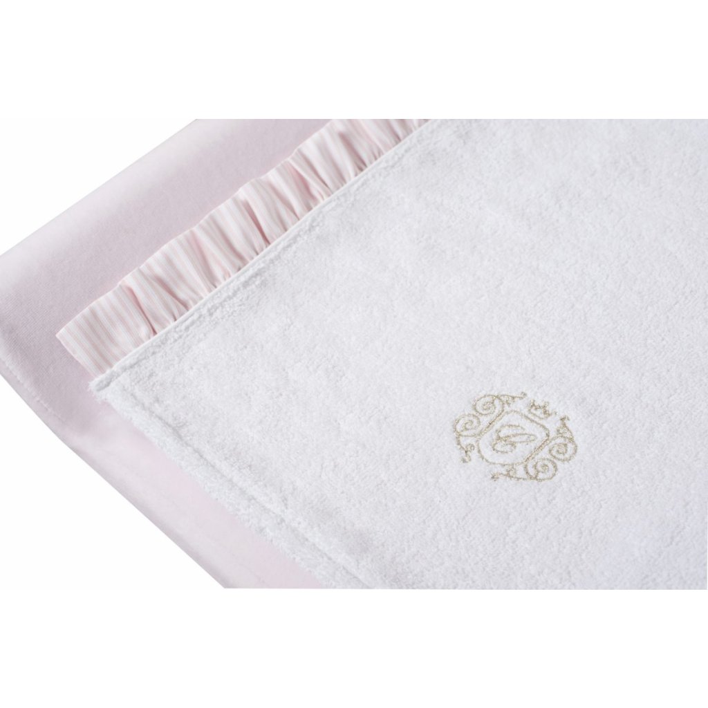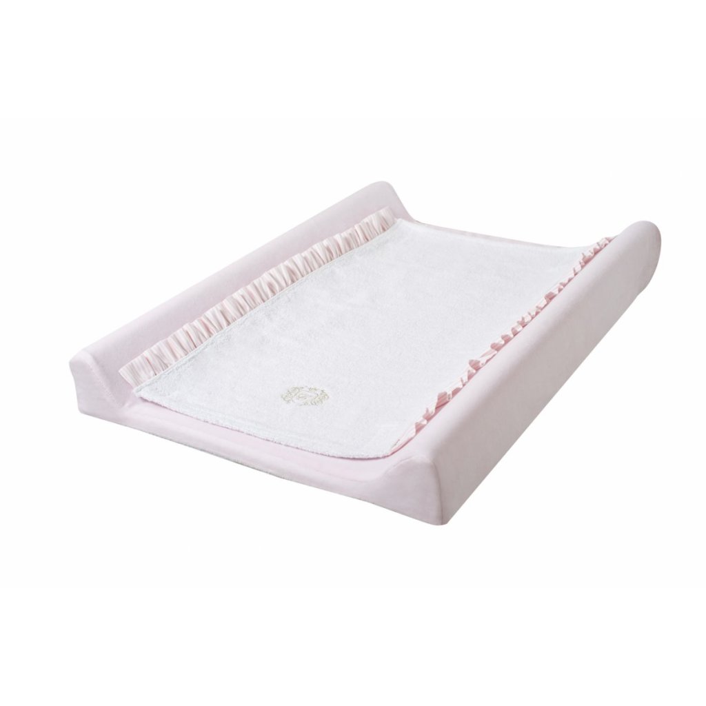 Vystužená elegantná prebaľovacia podložka mimoriadne pohodlná na prebaľovanie vášho bábätka vďaka vysoko kvalitným a jemným materiálom, pričom kombinuje funkčnosť s estetikou. Poduška je pokrytá snímateľným poťahom z ružového velúru s dodatočnou podložkou z froté látky zdobenej zlatým znakom a volánom s bielymi a bledoružovými pruhmi. Zvýšené okraje chránia dieťa pred úrazom. Certifikovaná prebaľovacia podložka bez škodlivých chemikálií, vyrobená z umývateľného PVC, pričom vnútro tvorí mäkká špongia.