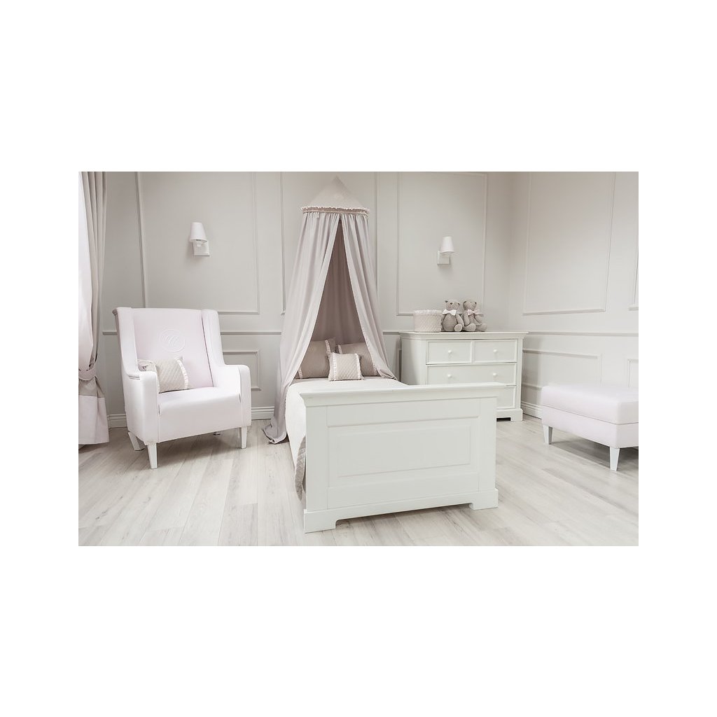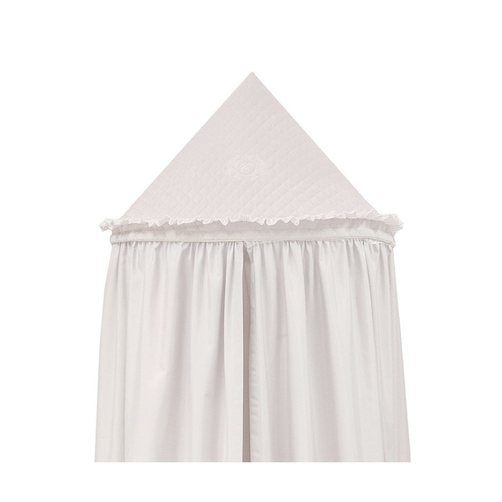 Krásny závesný baldachýn do detskej izby. Vyrobené z béžovej hladkej látky a prešívaného béžového velúru, zakončené krásnym béžovo-bielym pruhovaným volánom a zlatou vložkou. Baldachýn je zavesený na strope, je vhodný do detskej postieľky a veľkej postele.