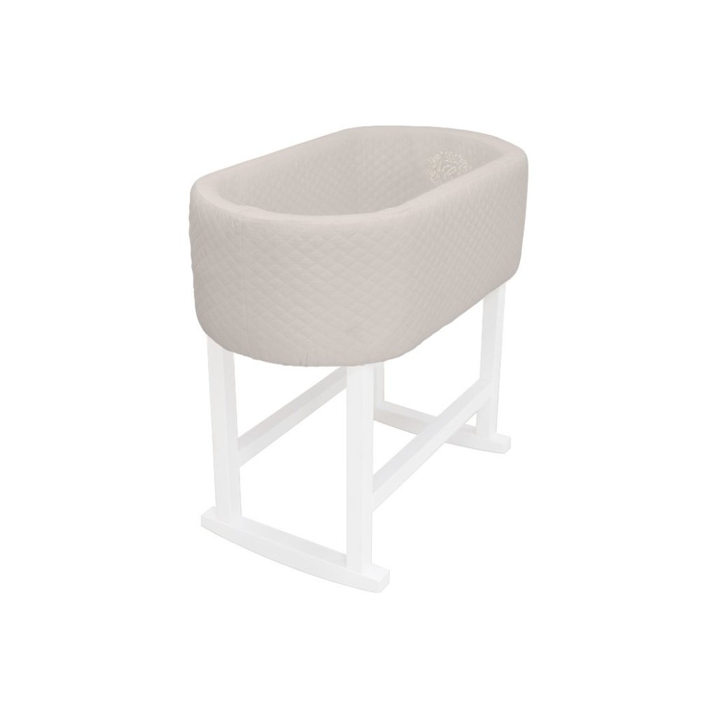 Elegantná kolíska čalúnená prešívaným velúrom v béžovej farbe a zdobená trojrozmernou výšivkou. Tento útulný kus nábytku poskytuje dieťaťu jemné hojdanie, a tým aj pokojný spánok.