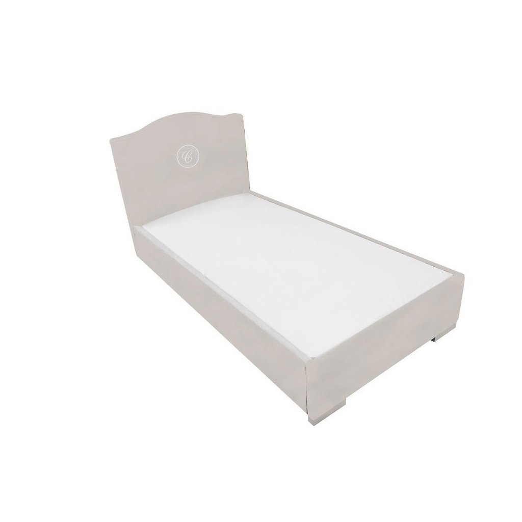 Elegantná detská posteľ s exkluzívnou výšivkou s písmenom „C“. Čelo postele a rám sú čalúnené kvalitnou umývateľnou textíliou vo farbe béžová, vďaka čomu je nábytok ešte funkčnejší.
