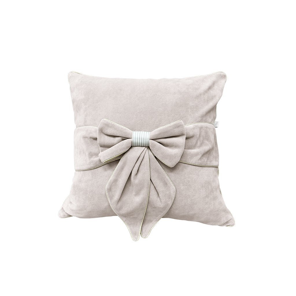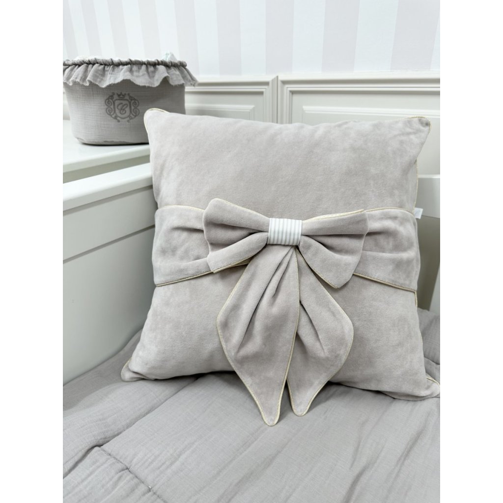 Originálny dekoračný vankúš s veľkou ozdobnou mašľou. Vyrobený z kvalitného velúru v studenom odtieni svetlej béžovej, zakončené zlatou lemovkou a bavlnou s béžovými prúžkami.