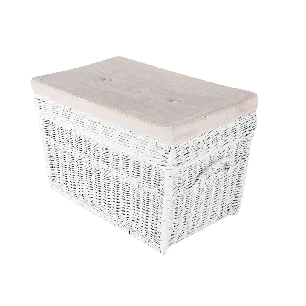 Dekoračný vankúš na prútený úložný box, vytvorí box na pohodlné sedenie alebo hranie. Je vyrobená z vysoko kvalitnej béžovej velúrovej látky a zdobená elegantným zlatým emblémom.