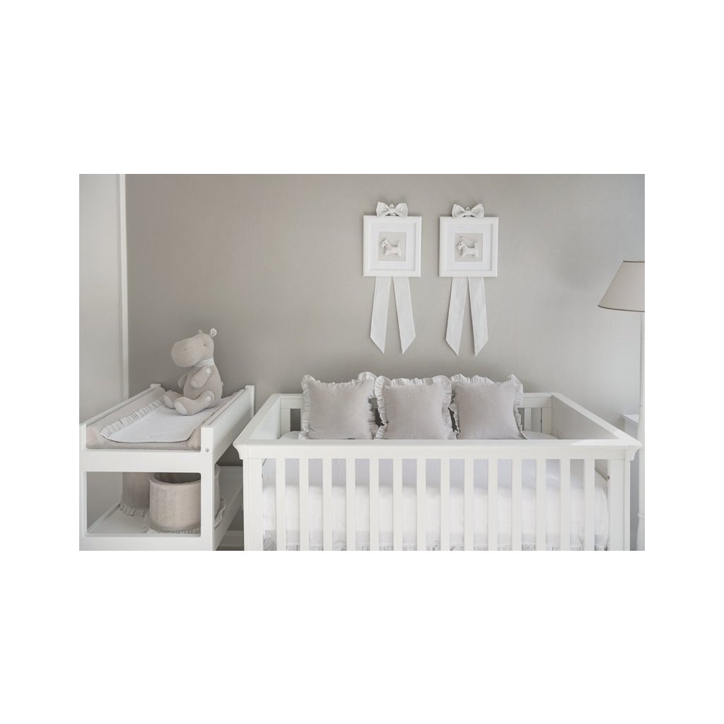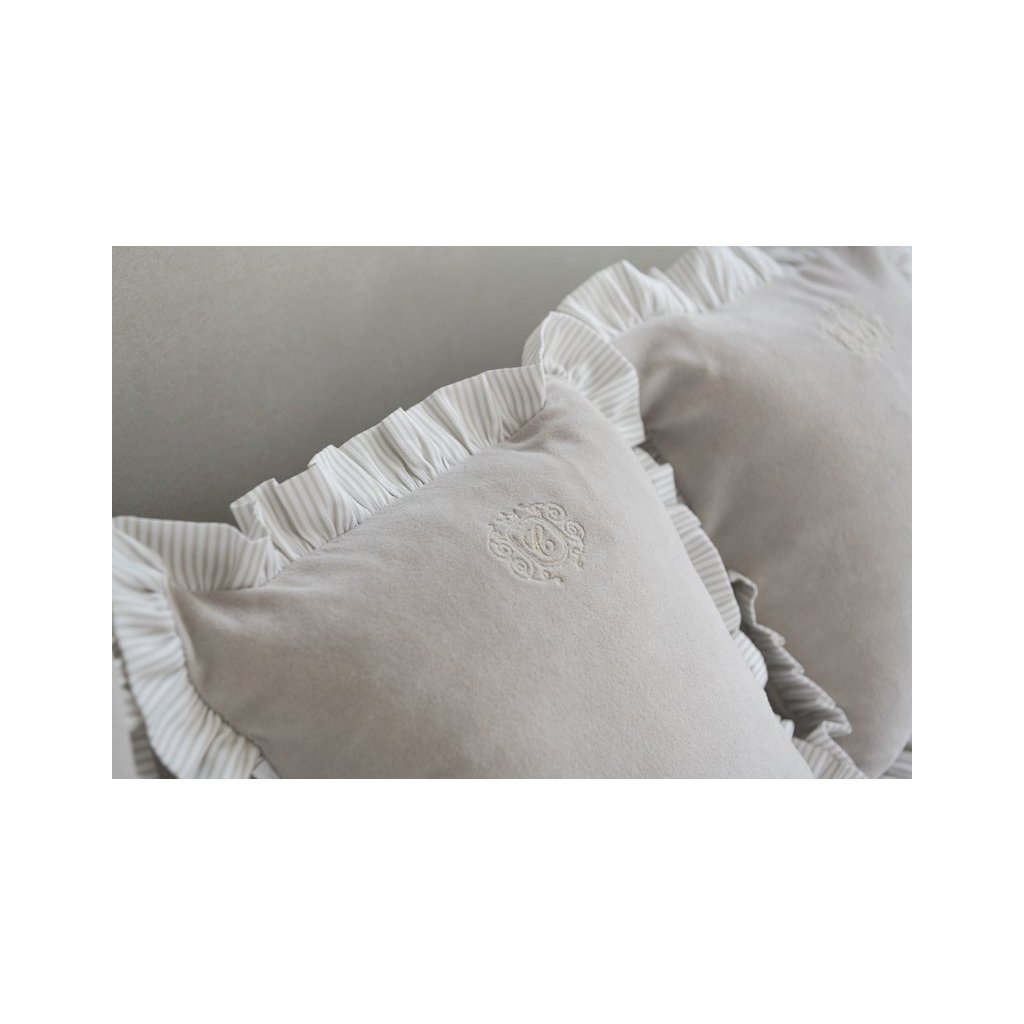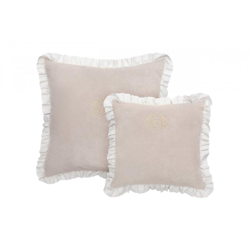 Rozkošný vankúšik z jemného béžového velúru. Zdobený elegantným zlatým znakom a rozkošnými volánikmi. Súčasťou vankúšika je obliečka na vankúš s výplňou. Dostupný v dvoch veľkostiach.