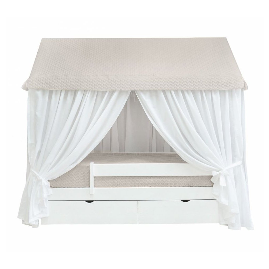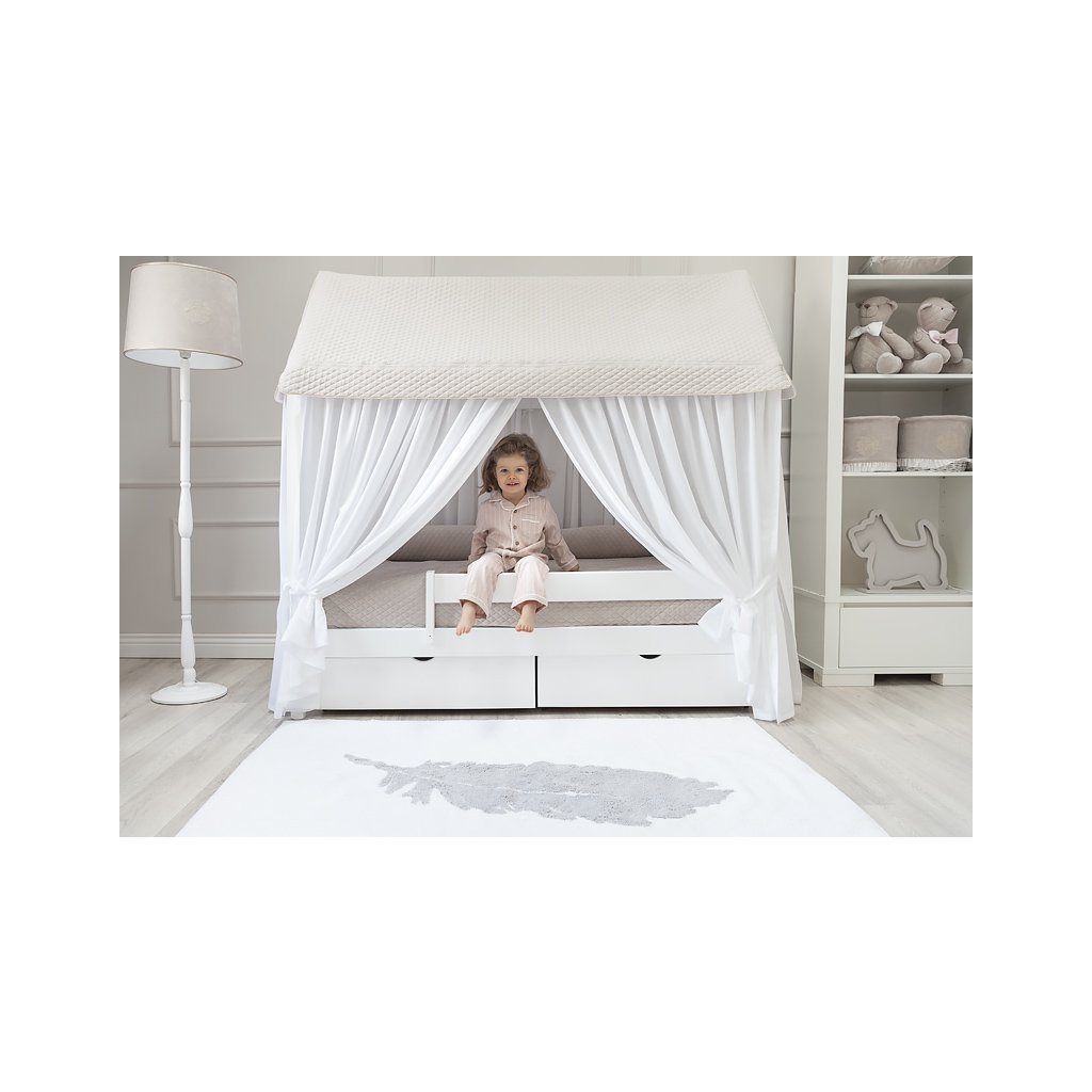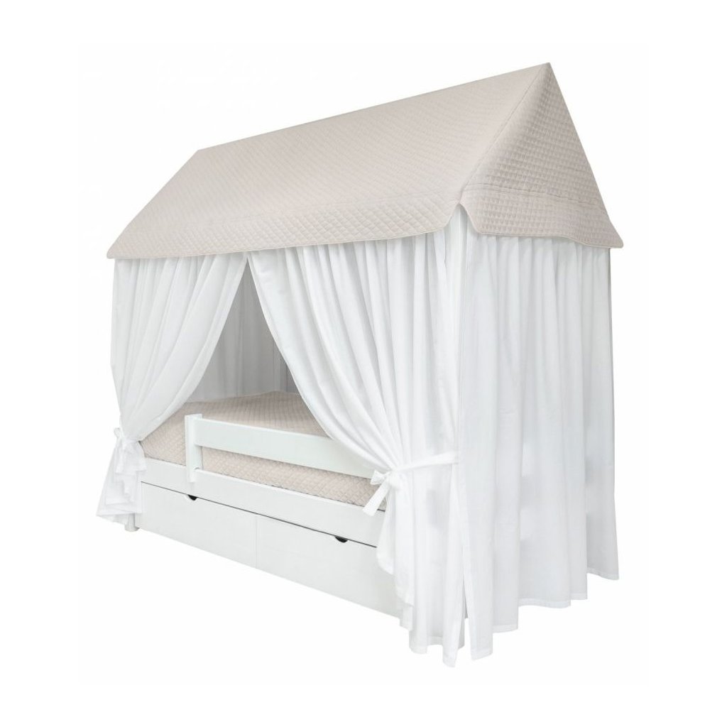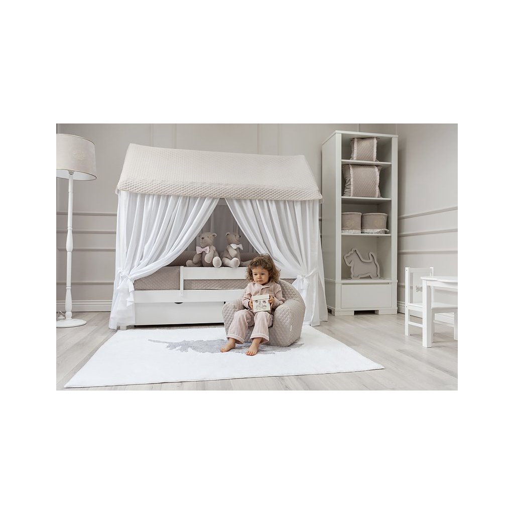 Úžasná posteľ v tvare domčeka. Posteľ vytvorí v izbe jedinečnú atmosféru. Strieška je vyrobená z béžového prešívaného bavlneného materiálu a „steny“ sú vyrobené z jemného bieleho textilu, zdobeného dvoma očarujúcimi mašličkami. Rozmer matraca 160 x 80 cm.